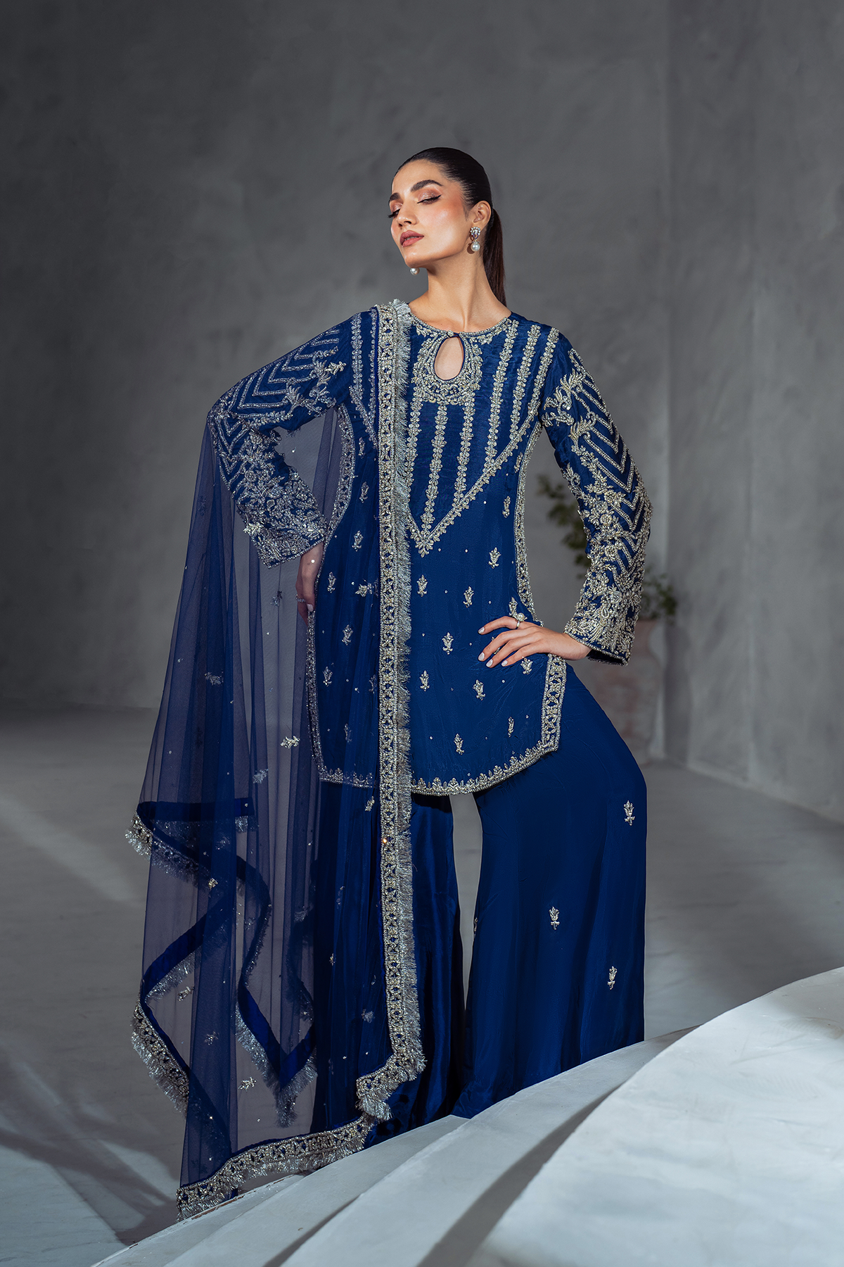 Elevate your style with this exquisite three-piece navy royal blue outfit, crafted from luxurious pure tassel silk. The ensemble features a beautifully designed shirt and chic flare pants, showcasing meticulous handwork with moti, diamonds, and crystals for a sophisticated sparkle.