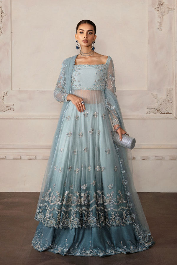 Elevate your style with this pure net creation, featuring a lined bustier and stunning hand craftmanship using a blend of modern materials. The ombre dyeing effect, embellished with crystals, pearls, different sizes of beads, pure glass beads, naqshi, bethki, and tilla, creates a captivating fusion of texture and elegance