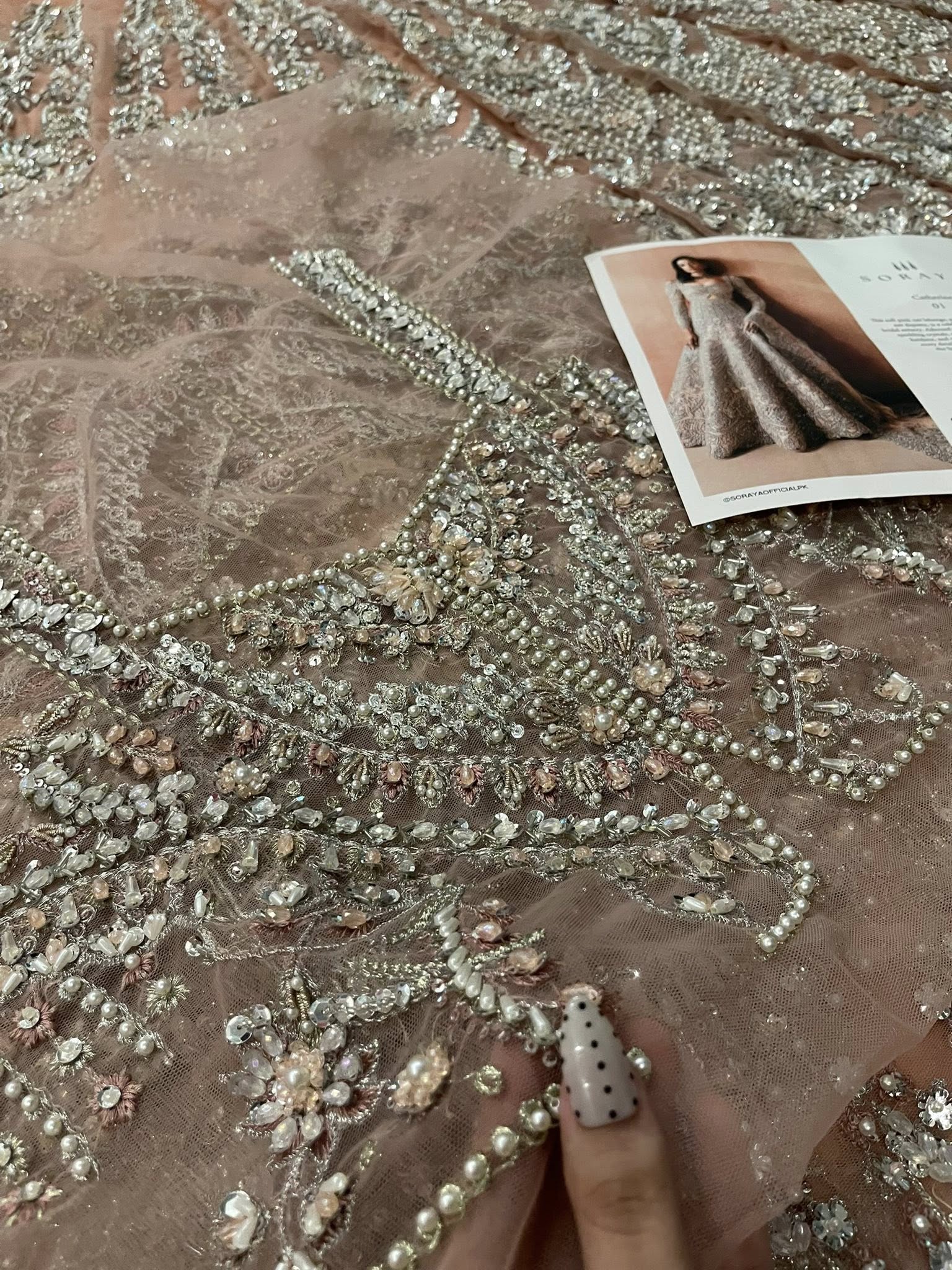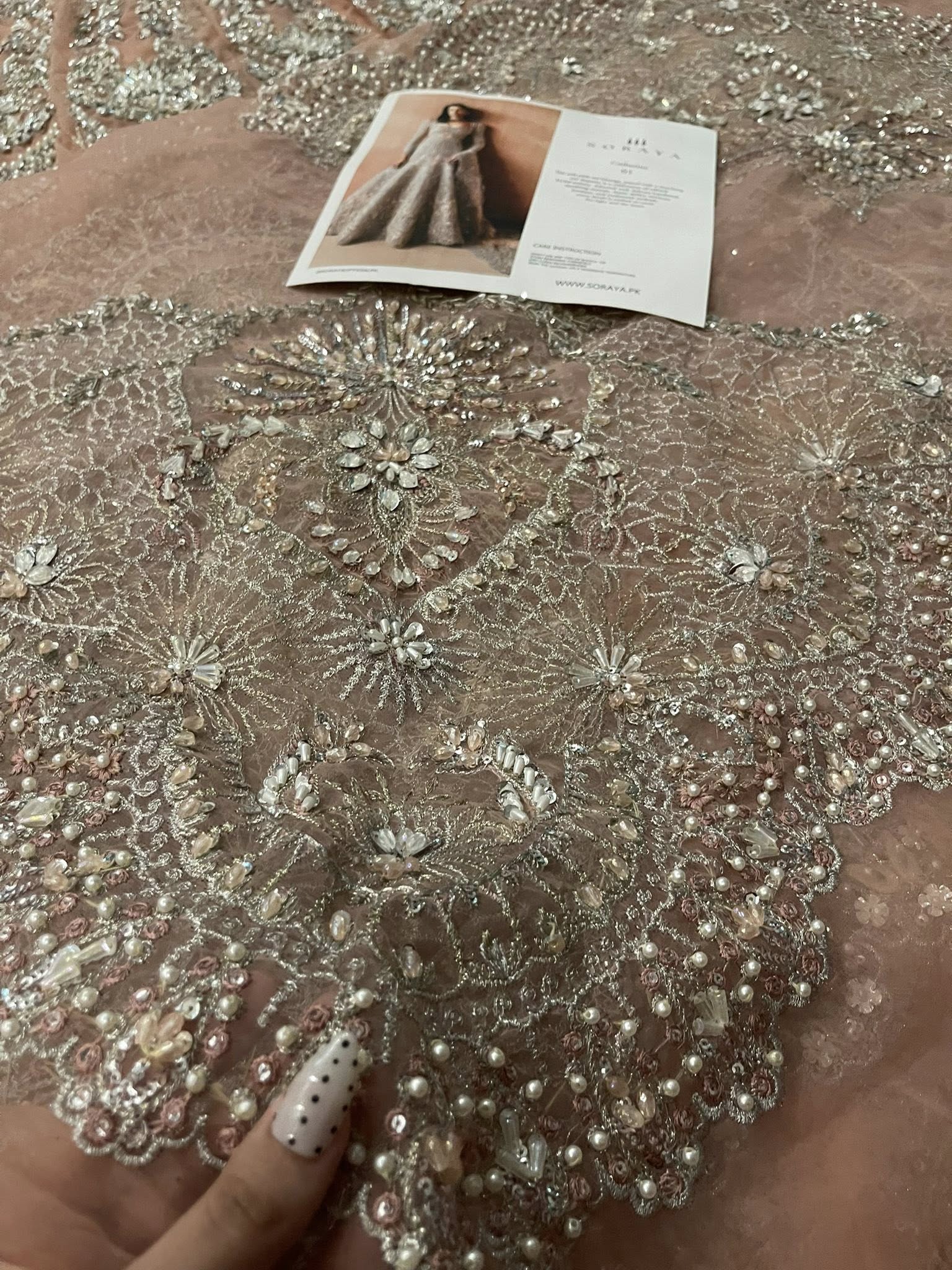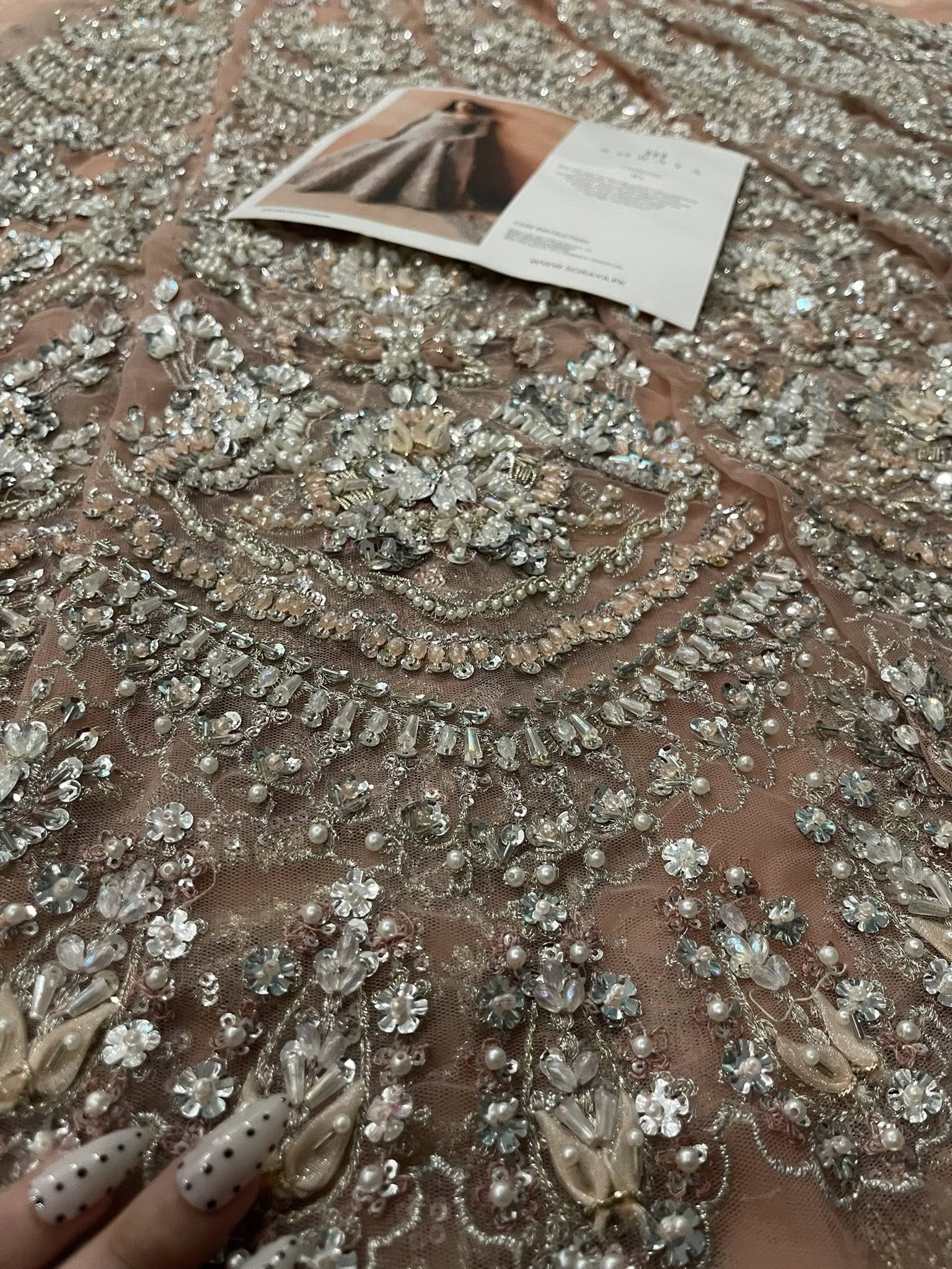 This soft pink net lehenga, paired with a matching net dupatta, is a celebration of refined bridal artistry. Adorned with delicate handwork sparkling crystals, classic dabka, intricate katdana, and traditional mukesh, every detail is crafted to catch the light and the heart.