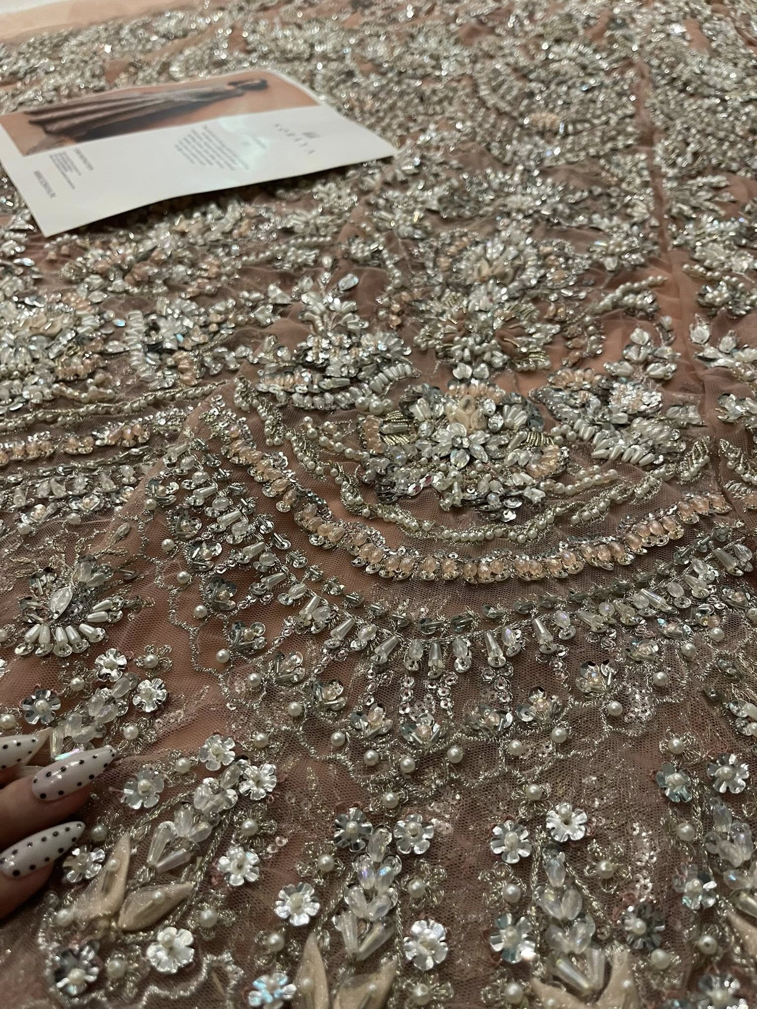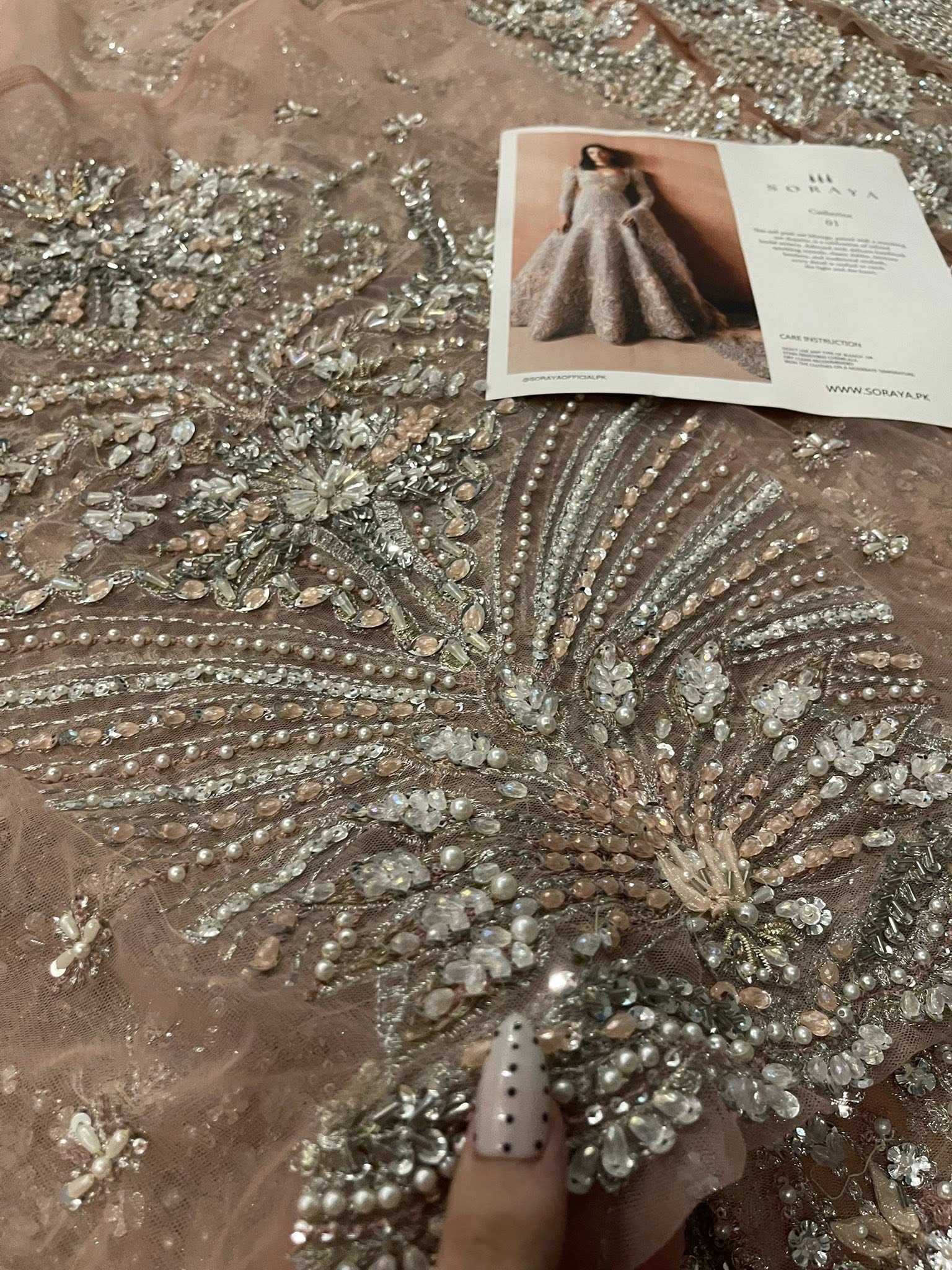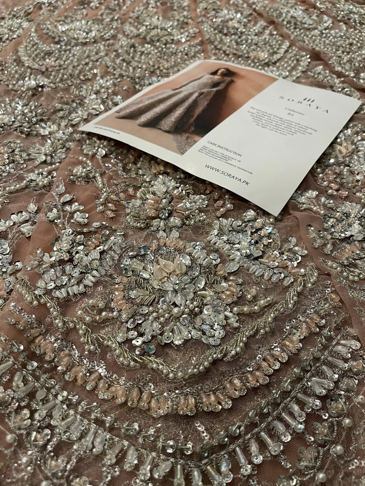 This soft pink net lehenga, paired with a matching net dupatta, is a celebration of refined bridal artistry. Adorned with delicate handwork sparkling crystals, classic dabka, intricate katdana, and traditional mukesh, every detail is crafted to catch the light and the heart.
