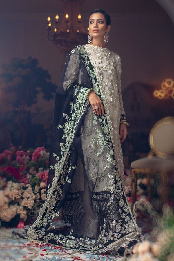 Crafted on luscious chiffon canvas and hand embellished with 3D organza details to represent the quintessential Élan aesthetic in the ‘Noir et blanc’. The exquisitely curated look is further accentuated with a contrasting dupatta in ebony with accents of gold crochet lace and filigree borders adding glamour and oomph to the entire outfit.