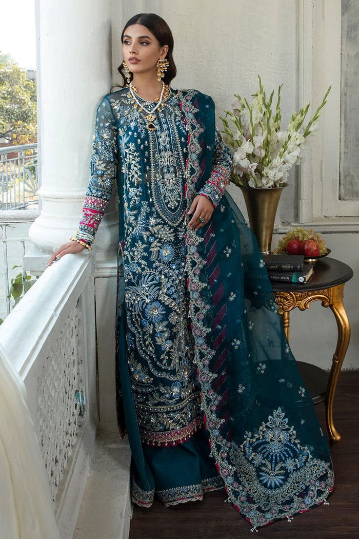 Diana is a gloriously curated silhouette serving festive fashion celestially with its appealing teal blue color and glinting adornments. An organza shirt and dupatta embedded with Fuschia pink hints and details of gota, crystals further fused with pearls and handwork details. Glistening silk pants are paired with it completing a quintessential festive look.
