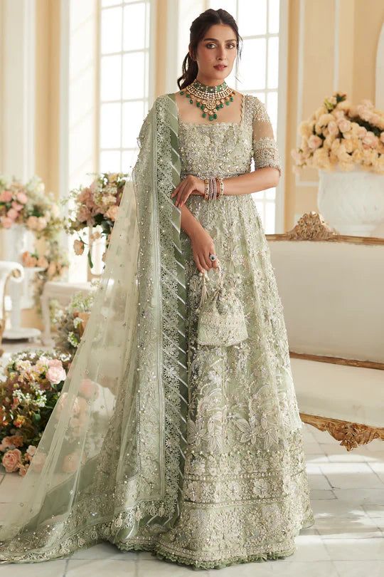 The enchanting 'Arya' rendered in ethereal pistachio is a vision of beauty, intricately adorned with a dazzling blend of shimmering silver sequins, pearls, and sparkling stones. Twelve stunning embroidered panels come together to form a magnificent heritage peshwas with a fully embellished bodice and a bejewelled belt. The dupatta is a frosted masterpiece, sprinkled with delicate crystals, pearls, and tinsel blooms along its borders acting as an ode to the grandeur of Eastern royal regalia. This couture-like ensemble is a dream come true for collectors, exuding classic elegance and timeless charm.