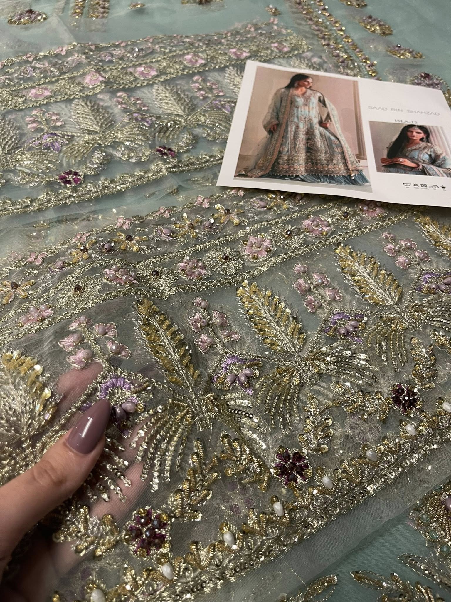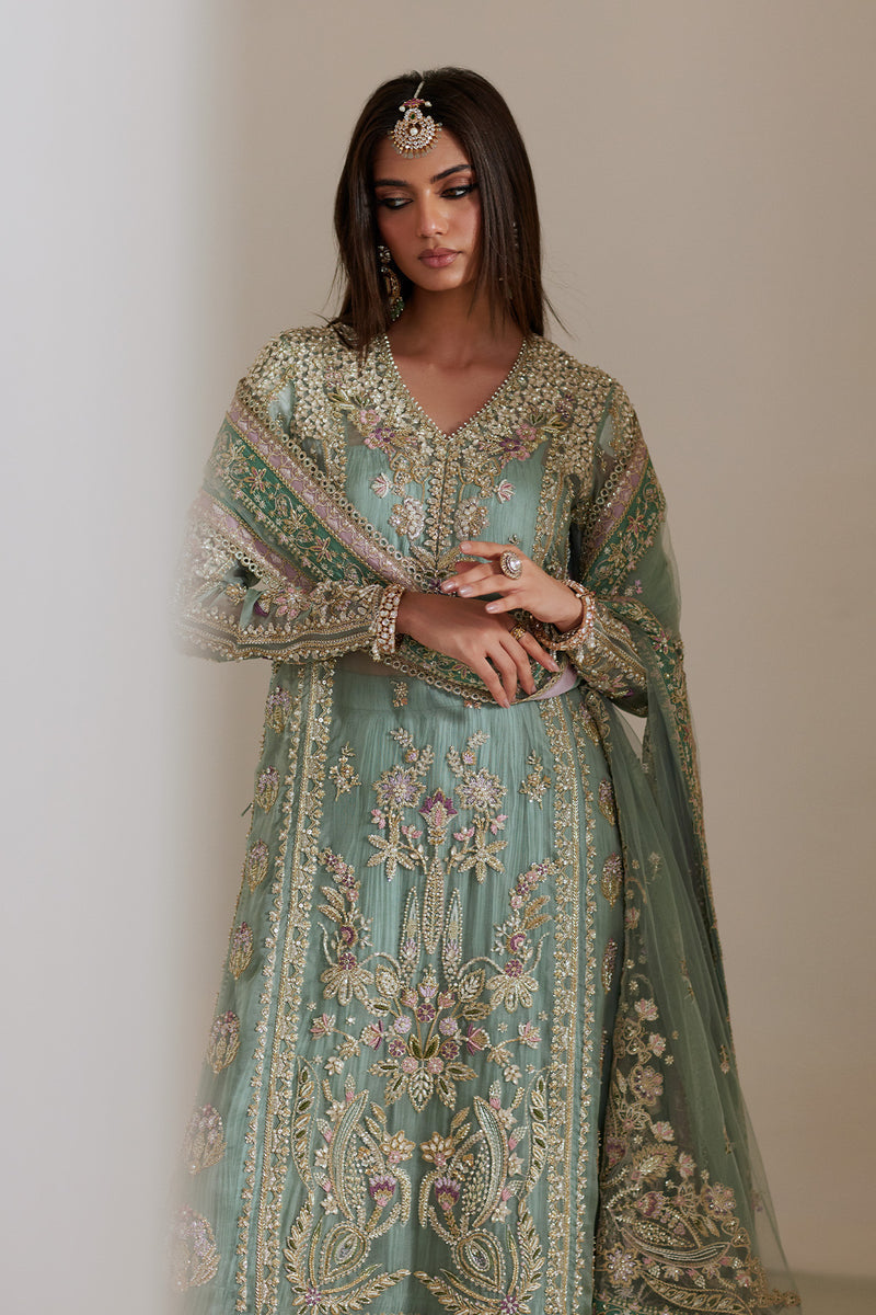 This luxurious turquoise outfit blends tradition with grace featuring a heavily embellished long shirt with exquisite Resham, Marori, and dabka work. The soft crushed sharara adds a layer of richness and movement, while the beautifully crafted dupatta completes the regal look. A timeless statement piece for celebrations that deserve something truly special.