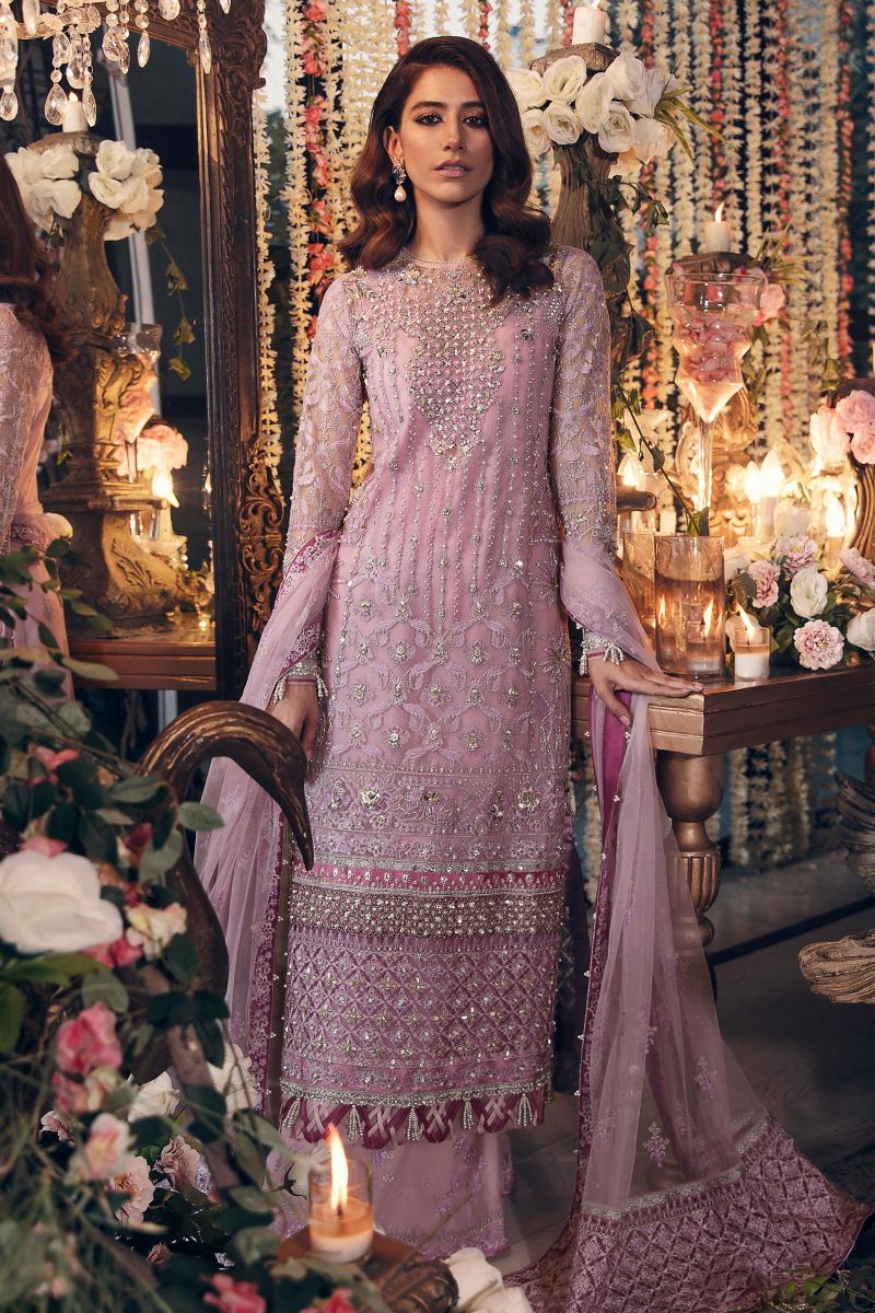 Rendered in blissful periwrinkle tones with exquisite embellishments, 'Nazanin' features shimmering thread and tilla with pearls, sitara and pops of berry thread work. Paired with tonal trousers and a colour blocked dupatta with elaborately worked borders, this feminine and flirty design is perfect for all festivities.?
