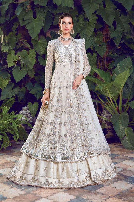 Radiating an unmistakable splendor, this exquisite pearl-white angrakha is adorned with intricate panni motifs on a delicate net background, further elevated by enchanting gotta and lappa embellishments along the hem. The flowing shirt is layered over a jamawar lehnga accentuated with a hand crafted silk border and suchi kiran finishings. It is accompanied by a net dupatta with an all over panni spray with a heavier handworked head border and a more delicate border along the three sides.