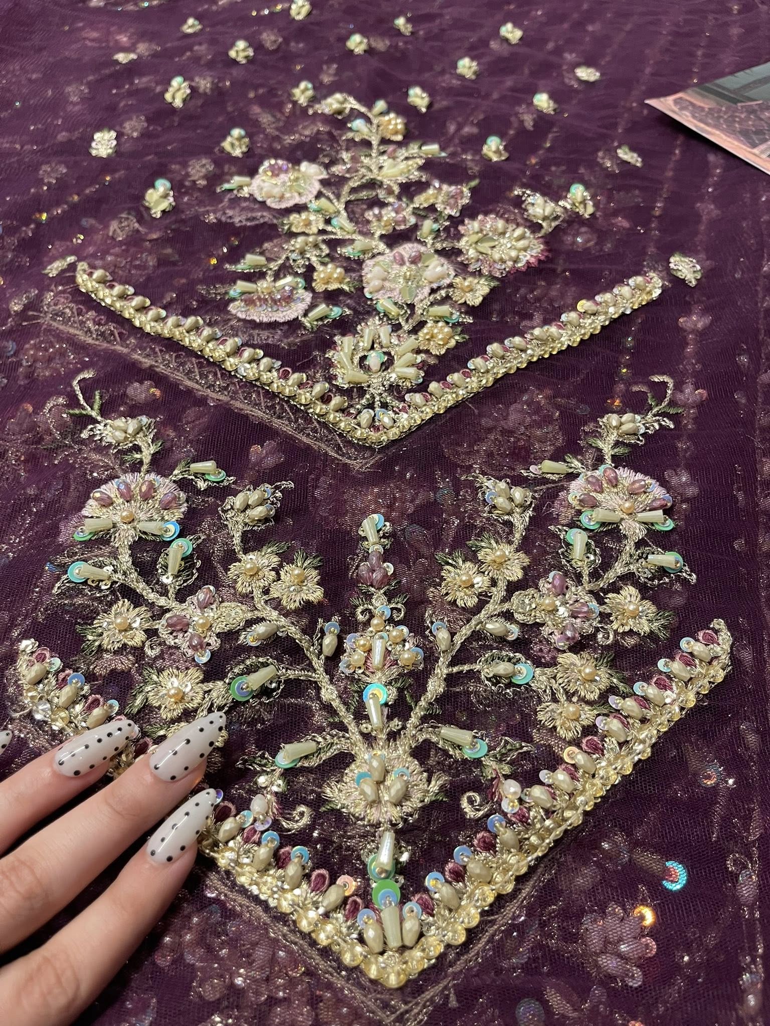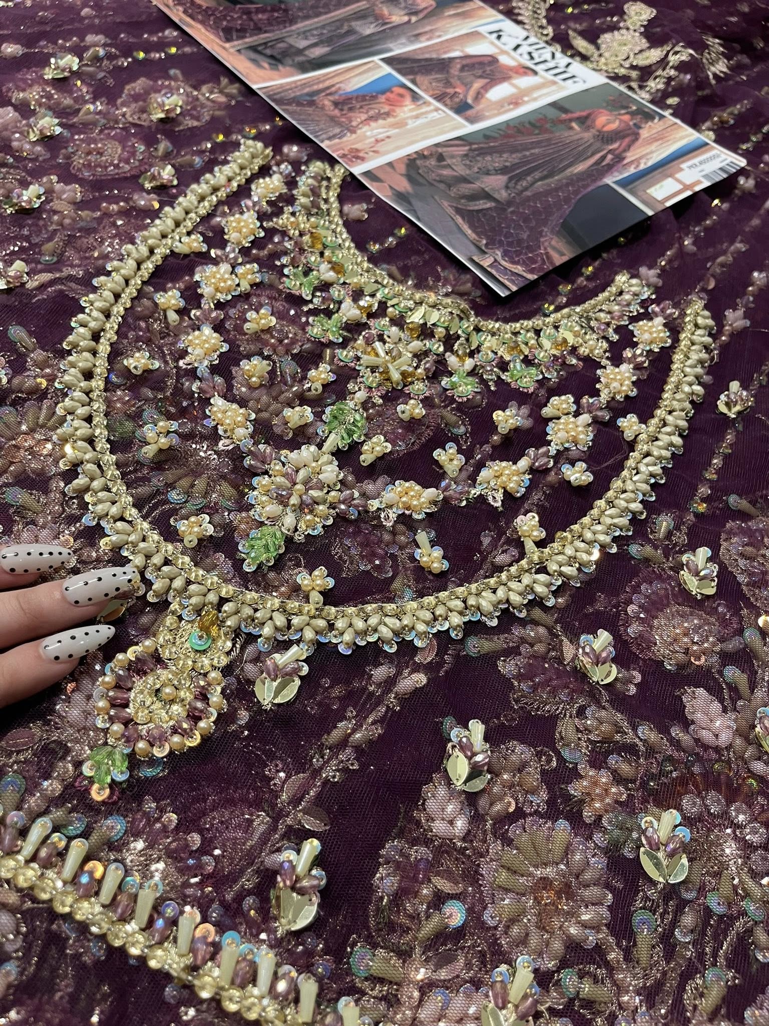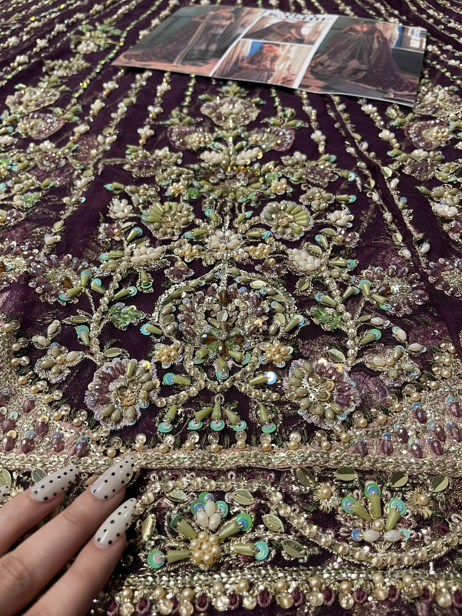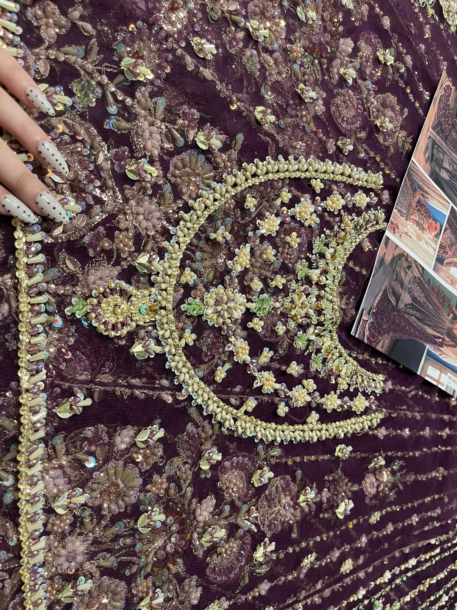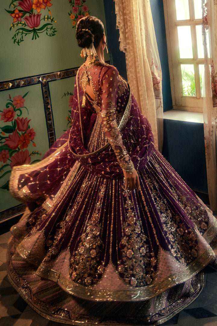 Behold the ethereal beauty of 'Hoor' a masterpiece woven with tilla and sequins, resham threads, and pure zardozi work. Embellished with Swarovski crystals, kora, dabka, nakshi, pearls, and Japani cut dana, each detail is a testament to refined elegance. The French knots of dabka add a finishing touch, crafting a bridal vision that transcends time