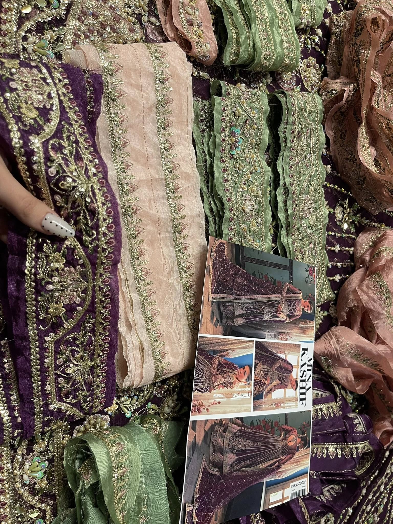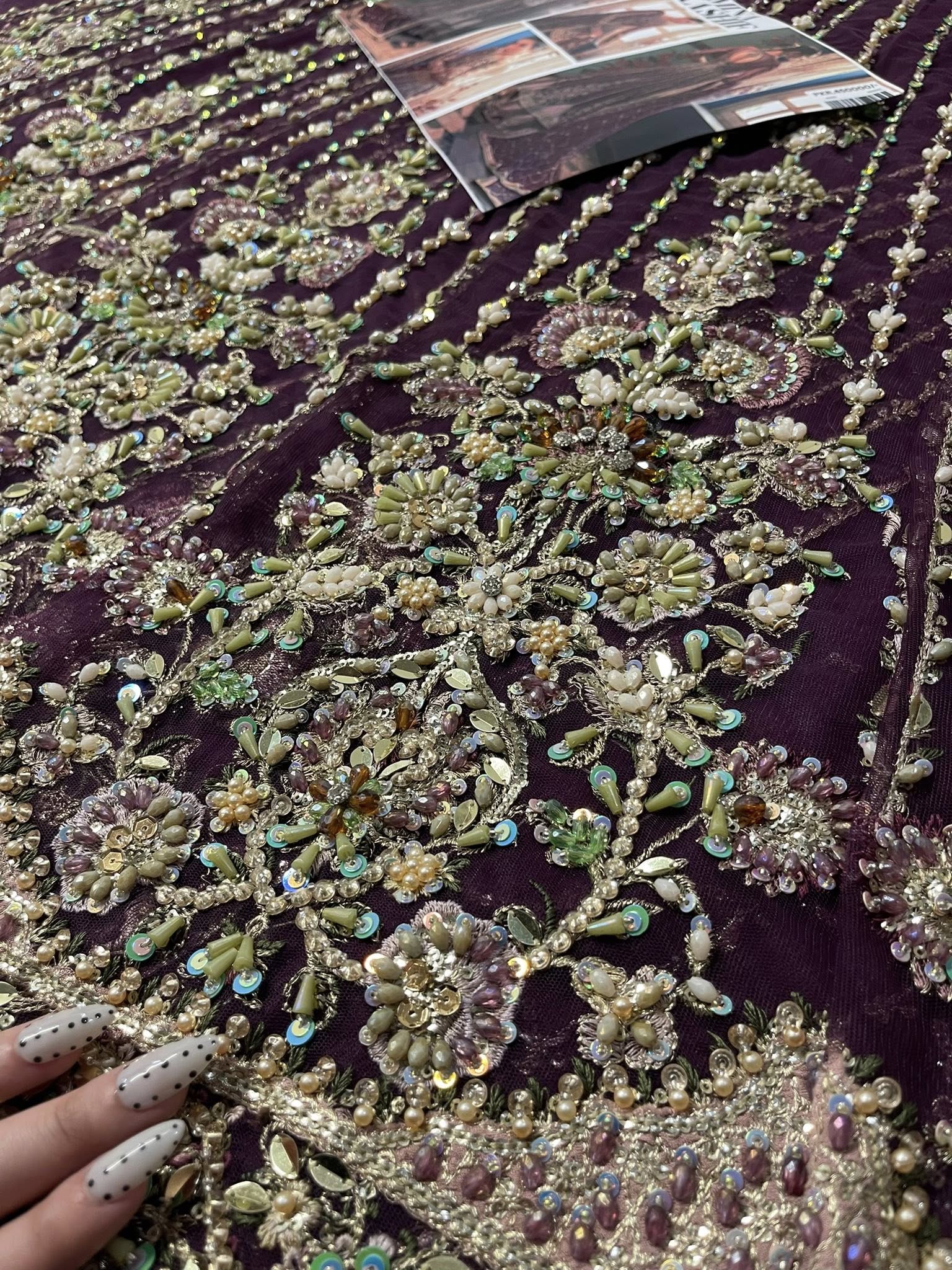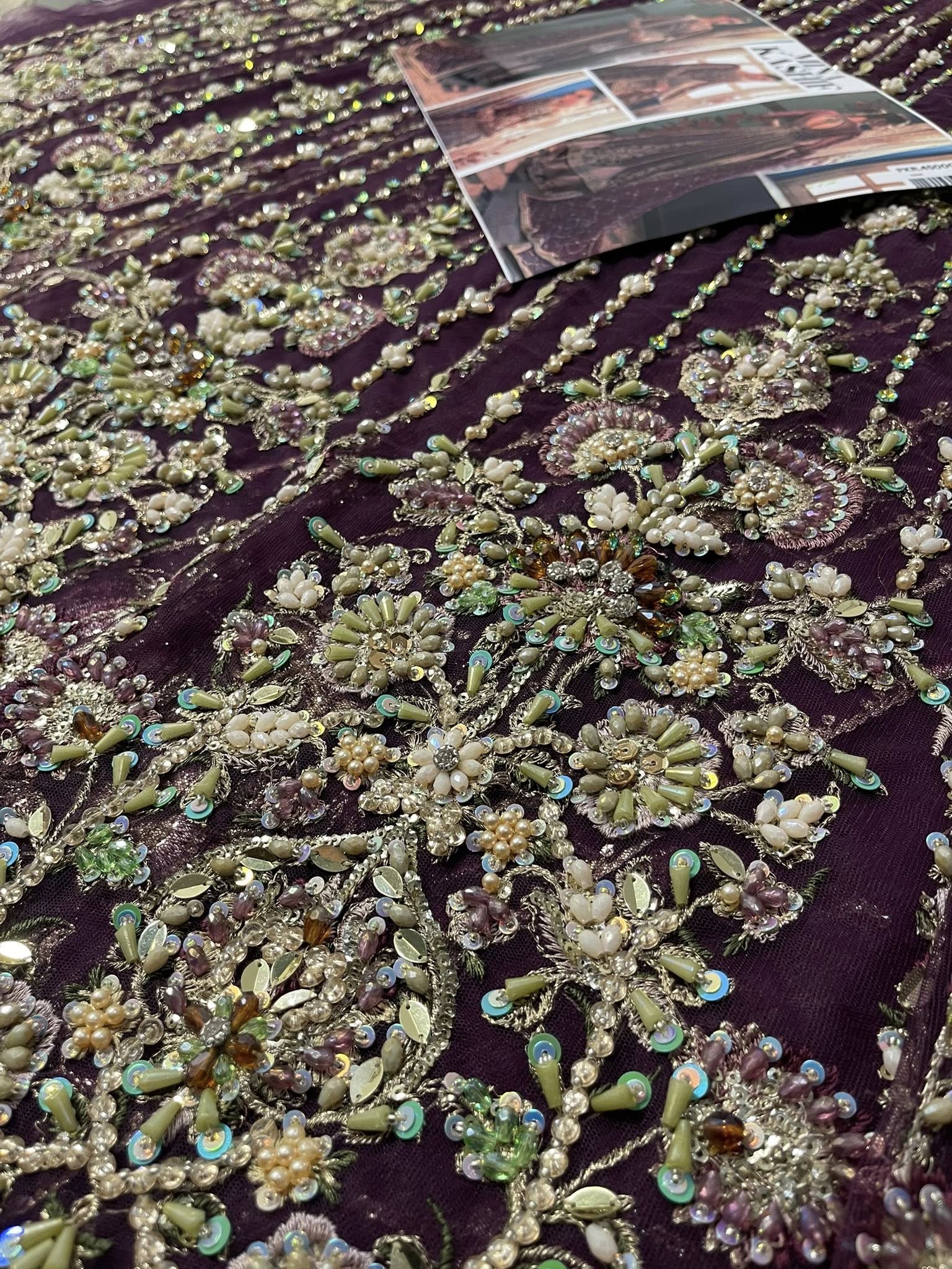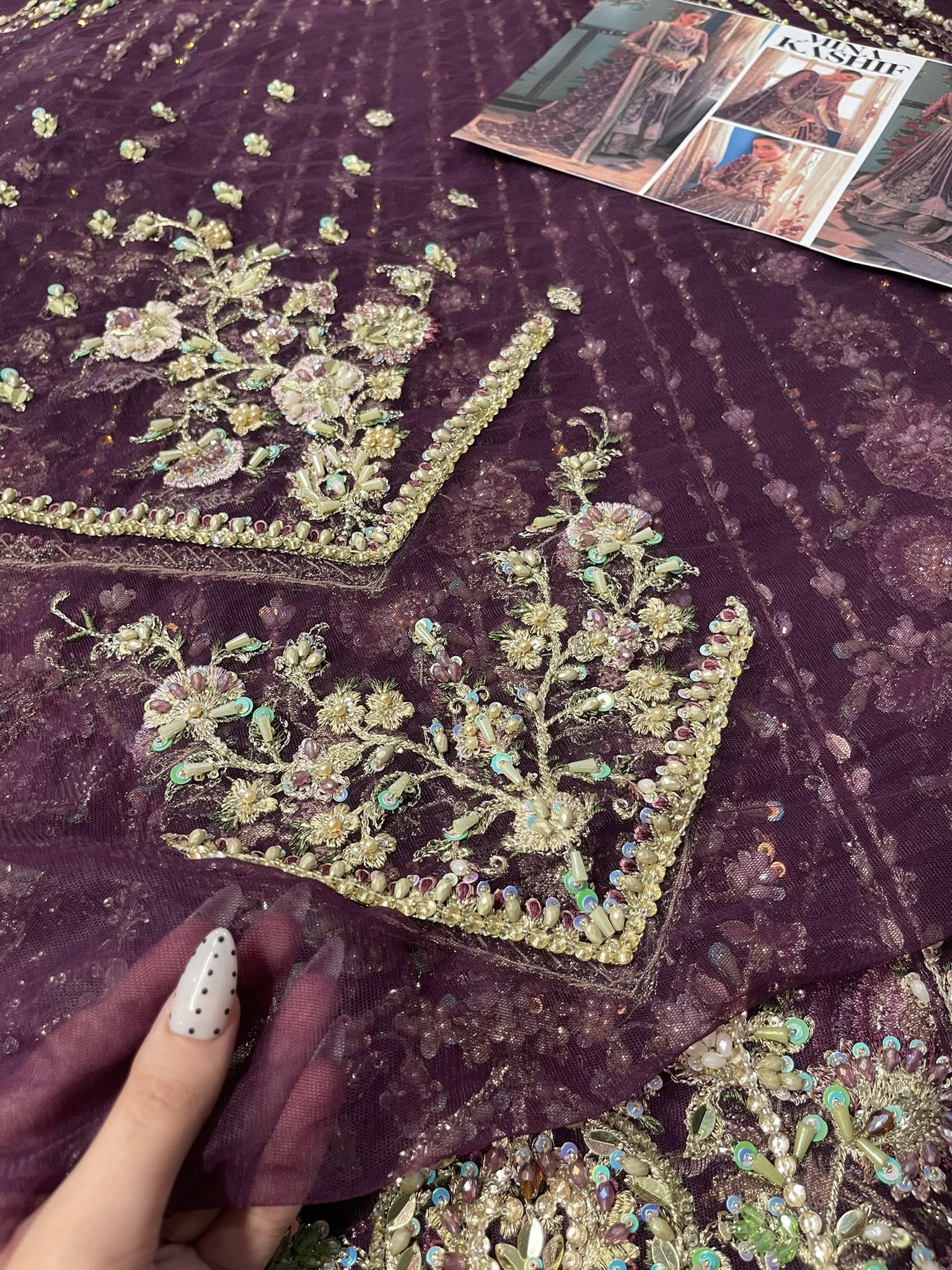 Behold the ethereal beauty of 'Hoor' a masterpiece woven with tilla and sequins, resham threads, and pure zardozi work. Embellished with Swarovski crystals, kora, dabka, nakshi, pearls, and Japani cut dana, each detail is a testament to refined elegance. The French knots of dabka add a finishing touch, crafting a bridal vision that transcends time
