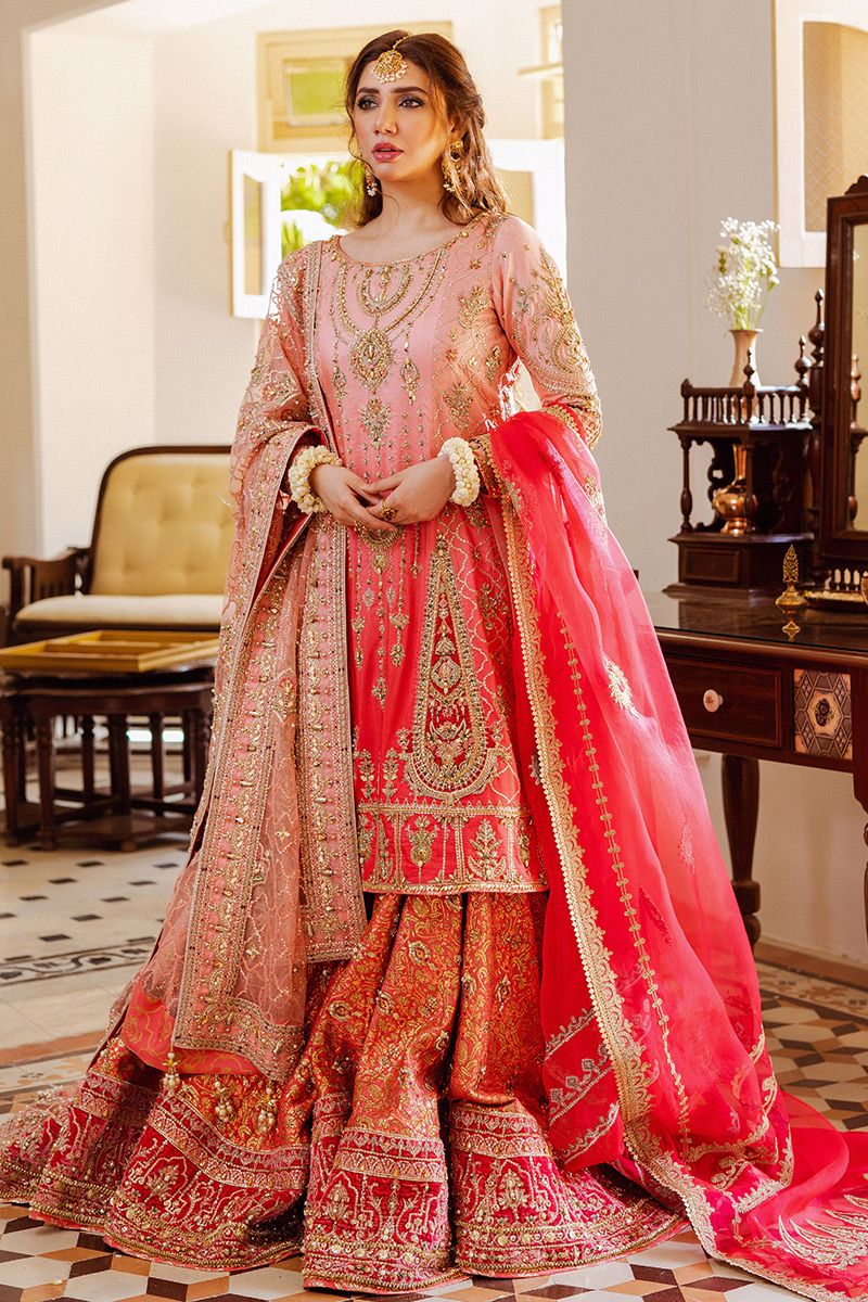 Introducing ‘Lueur Dorée,’ an extraordinary ensemble destined to command the spotlight with its opulent elegance. This luxurious masterpiece, crafted from a sumptuous obsidian canvas, is adorned with an exquisite array of sequins, crystals, GOTA, and ebony pearls, all accentuated with scintillating gold to create a striking and unforgettable statement. The intricate embellishments form patterns that resemble verses of gilded poetry, meticulously woven into the fabric. Paired with a diaphanous organza dupatta, framed by an exquisitely embellished border, this ensemble epitomizes the pinnacle of refined design and style. Ensuring the wedding festivity is transformed into a vision of sophistication and charm, ‘Lueur Dorée’ stands as the quintessential highlight of any celebration, embodying timeless luxury and unparalleled beauty.