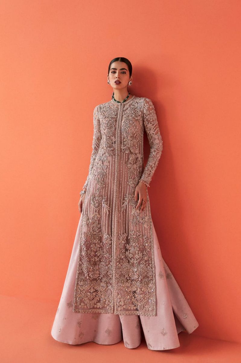 Amtul exquisitely features the beaming crystals all over the front-open organza jacket made out of net. Paired with the conventional lehnga on the refreshing tone of lavender; a complete look straight out of your dreams.