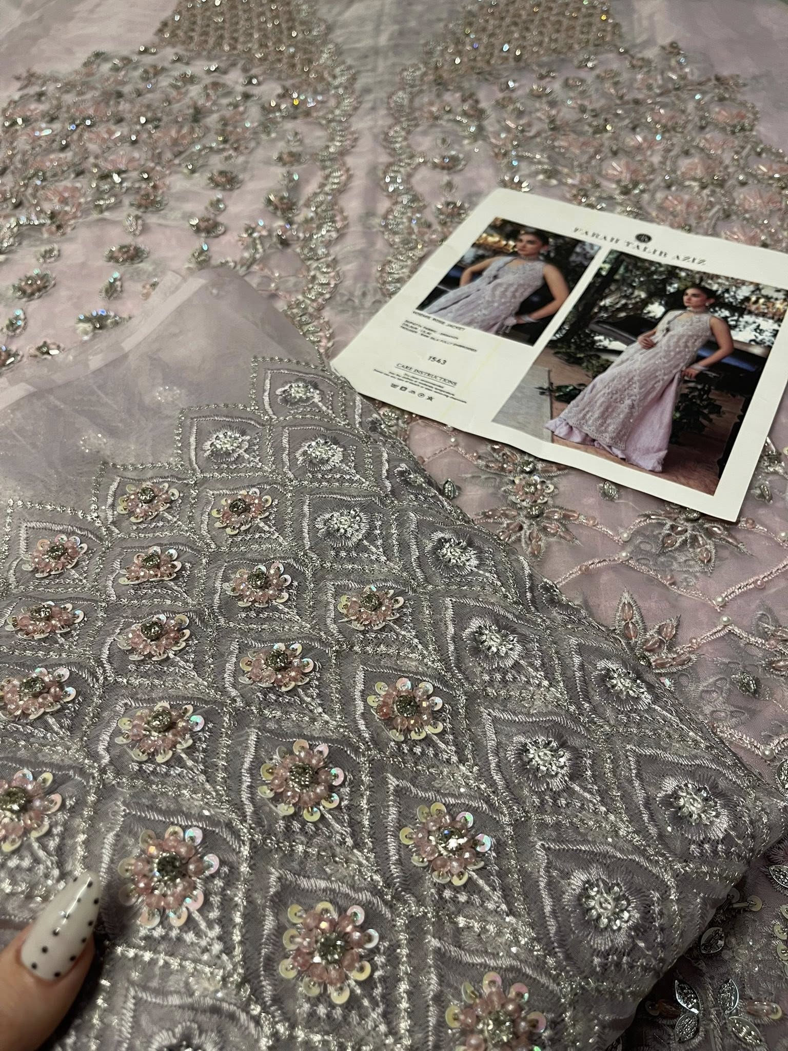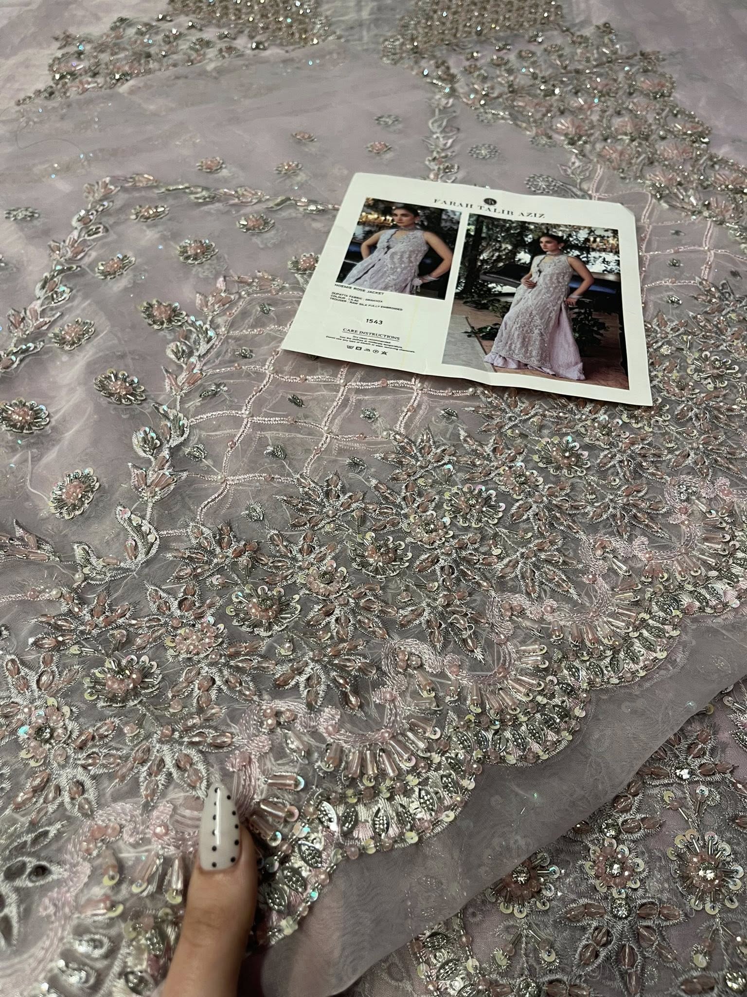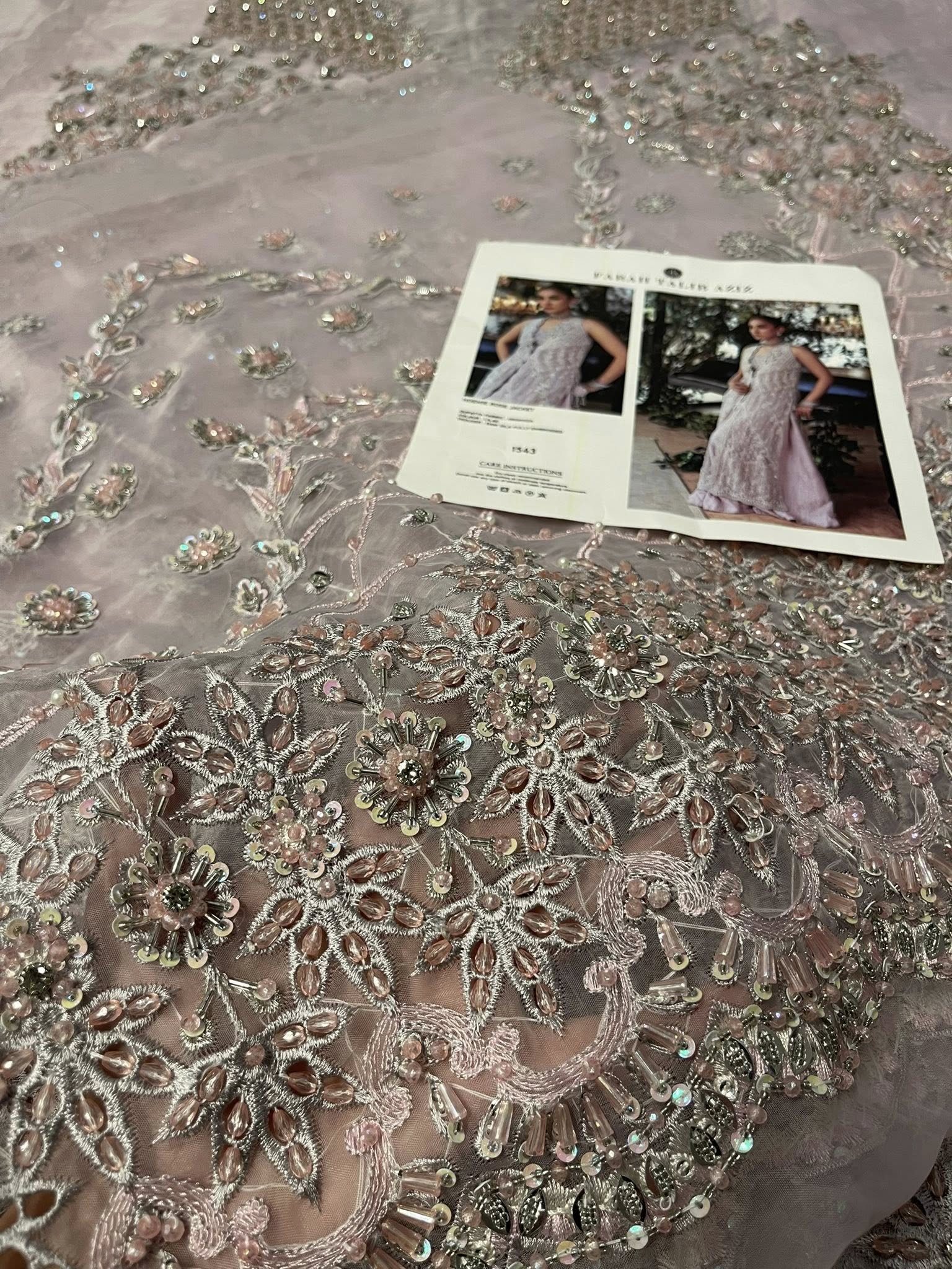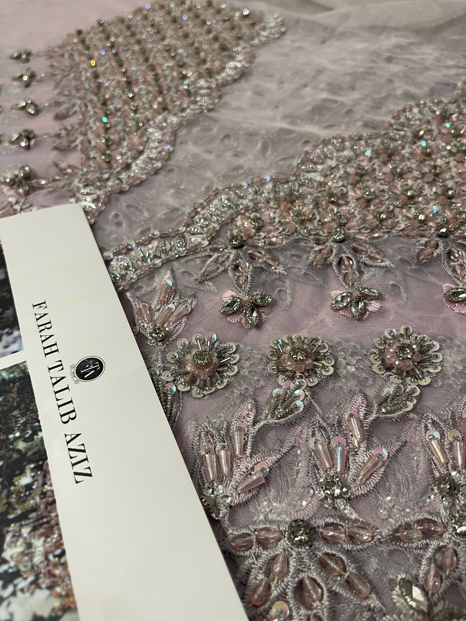 Romantic, refined, and beautifully detailed — this dusty pink schiffli jacket set is a celebration of soft elegance and artisanal craft. The jacket is delicately hand-embellished with clusters of pearls, Swarovski crystals, and intricately formed 3D flowers. Fine cutwork adds texture and dimension, while the front-open silhouette reveals a hand-embellished bustier for a modern layered look.