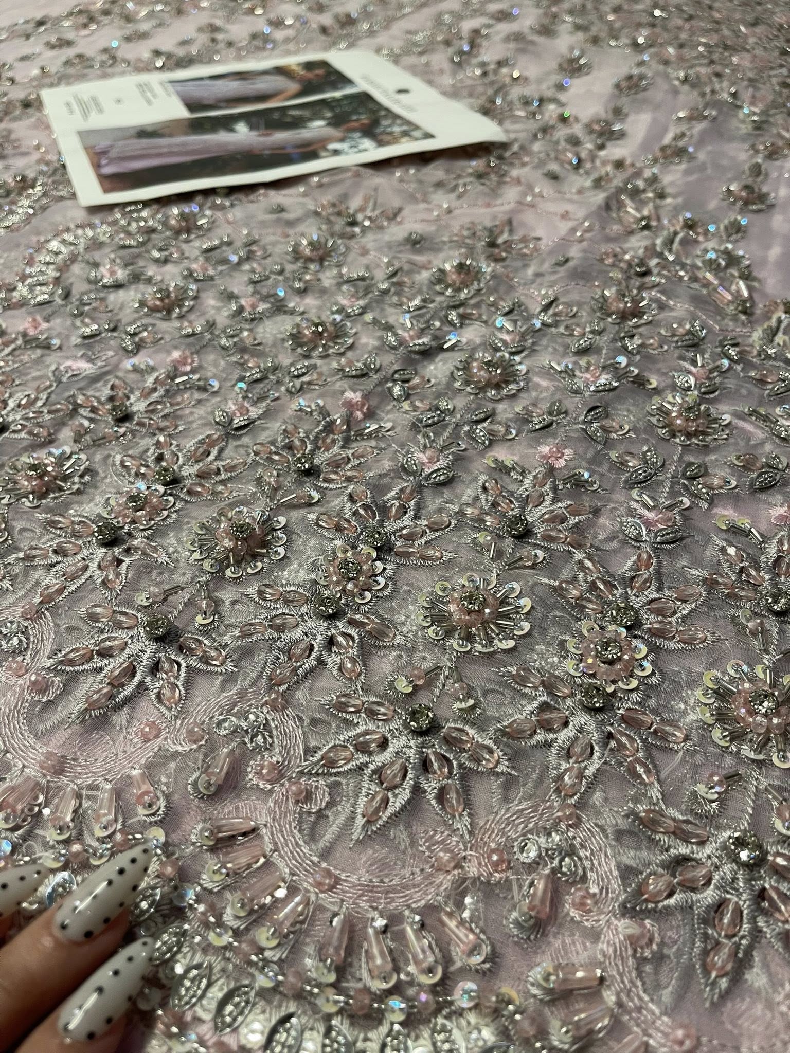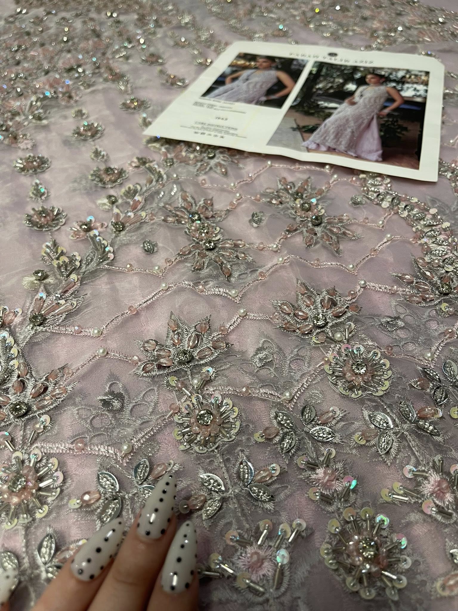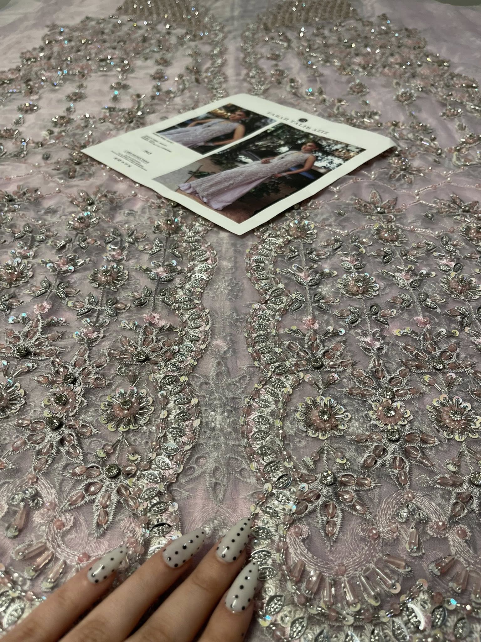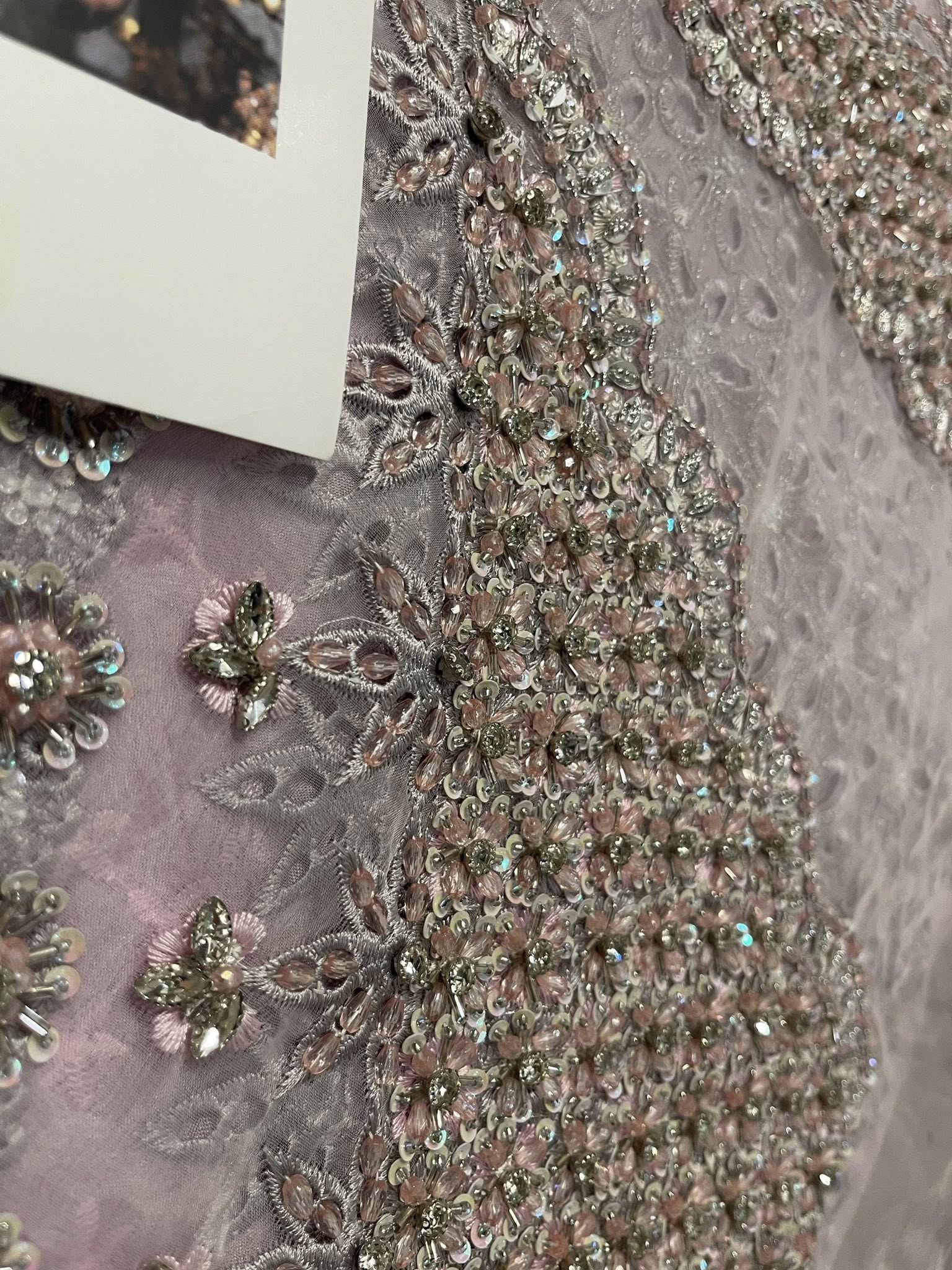 Romantic, refined, and beautifully detailed — this dusty pink schiffli jacket set is a celebration of soft elegance and artisanal craft. The jacket is delicately hand-embellished with clusters of pearls, Swarovski crystals, and intricately formed 3D flowers. Fine cutwork adds texture and dimension, while the front-open silhouette reveals a hand-embellished bustier for a modern layered look.
