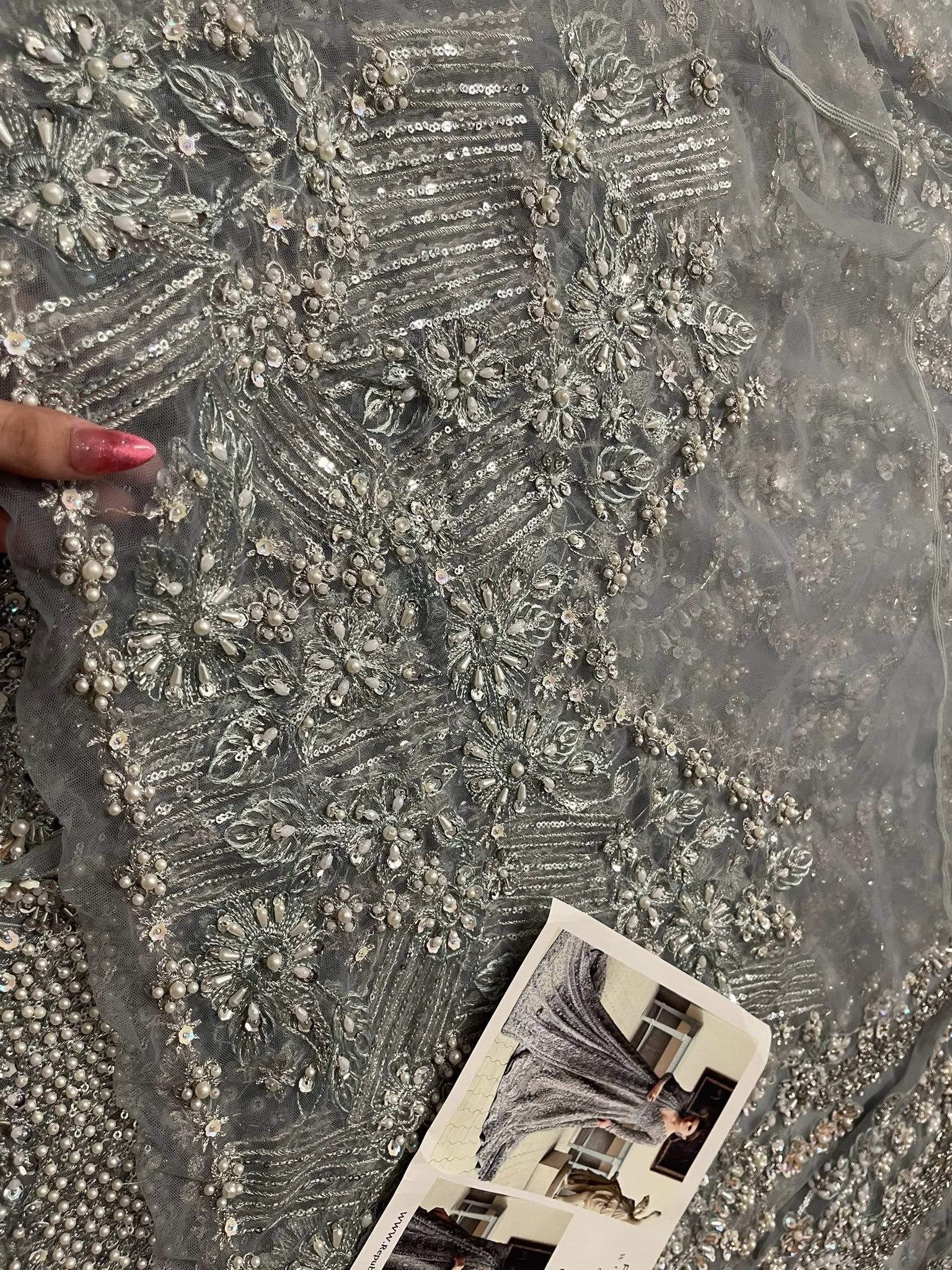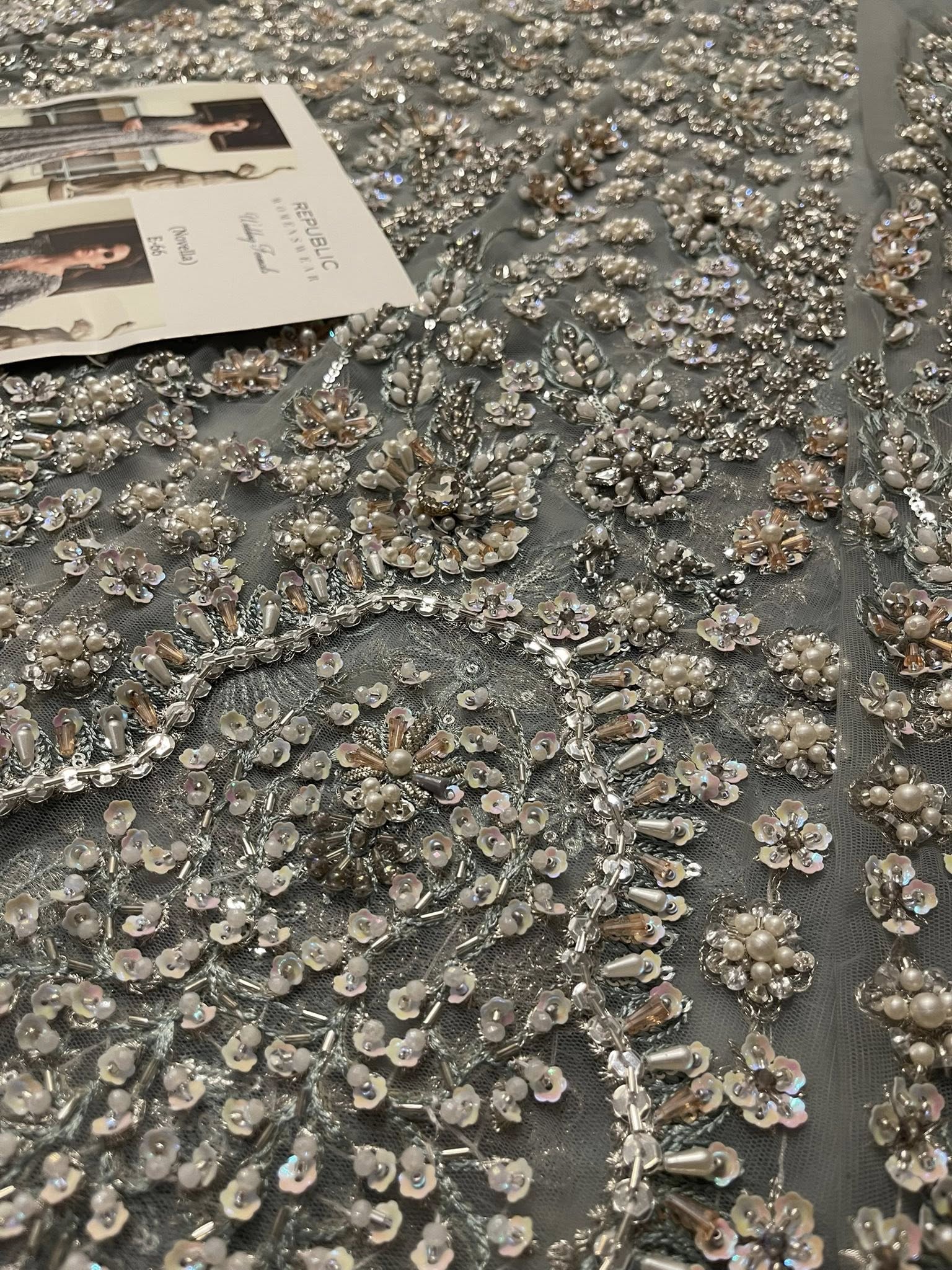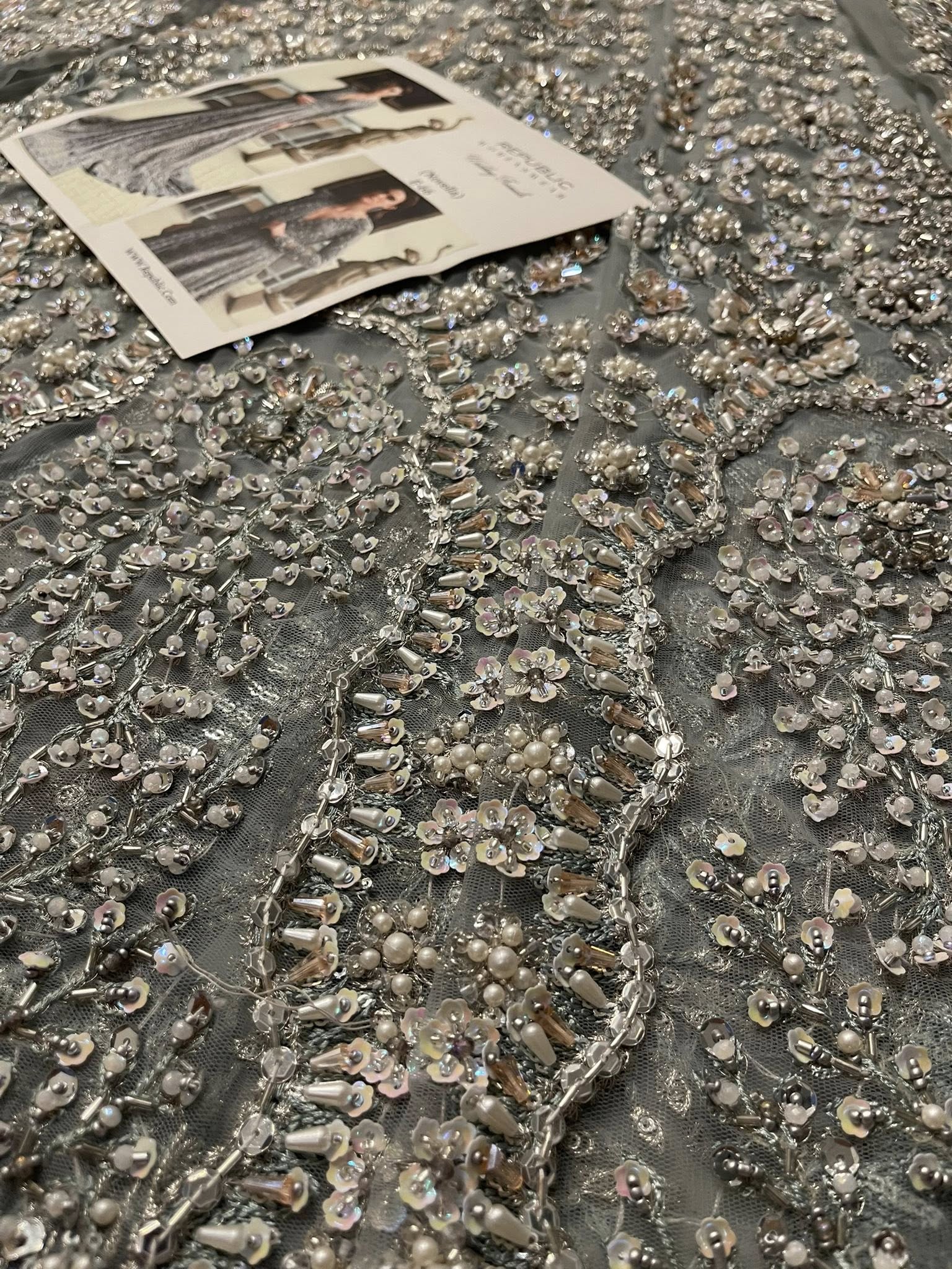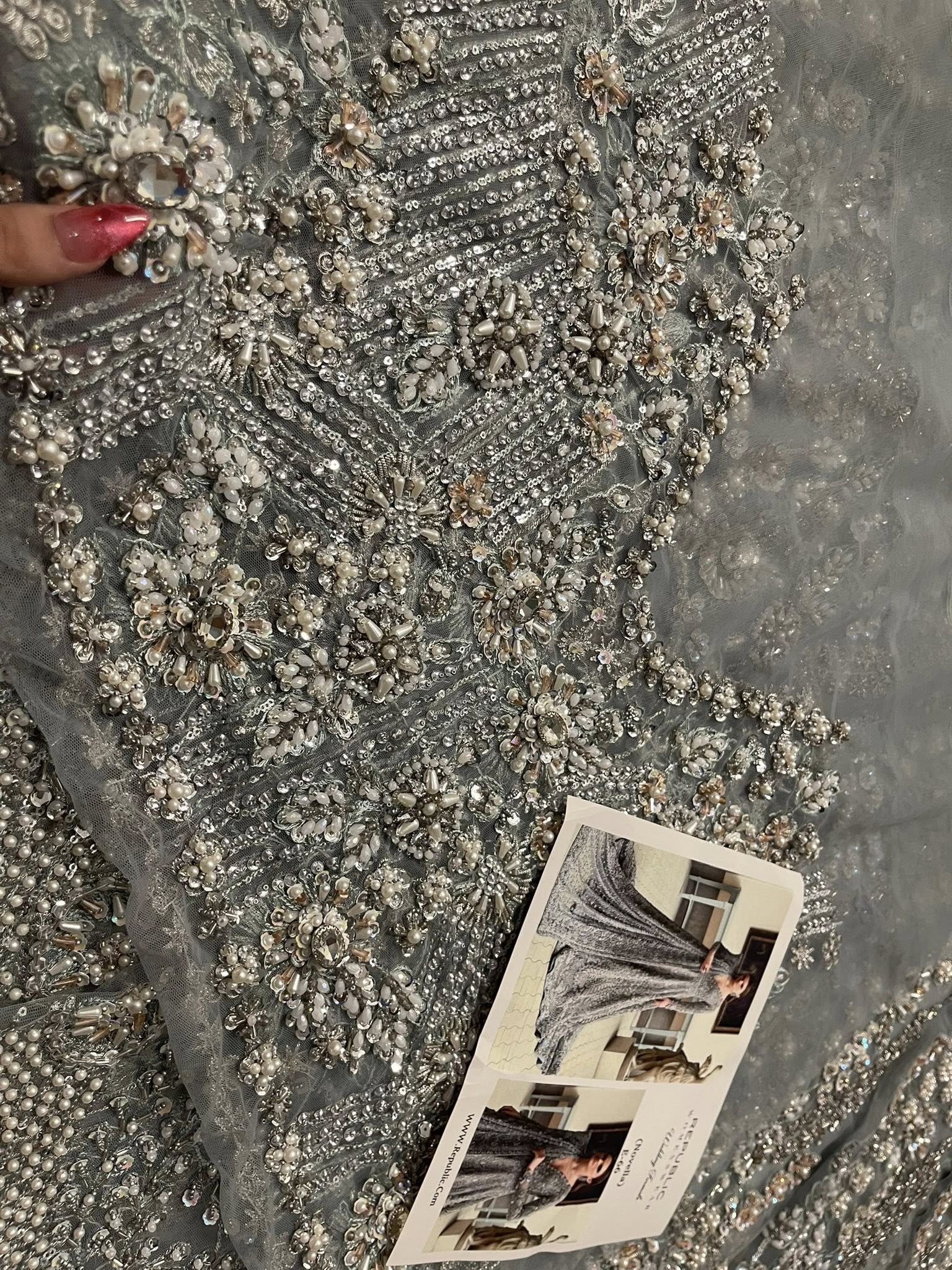 Novella is a V neckline gown, fully fitted and adorned with running floral compositions, leaves, petals, and branches. The gown features geometric details and organza pastels, enriched with tulle details, bethki, mukaish, and ribbon work. Intricate naqshi, kora, dabka, resham tilla work, Swarovski sequins, and cutdana add to its timeless elegance.