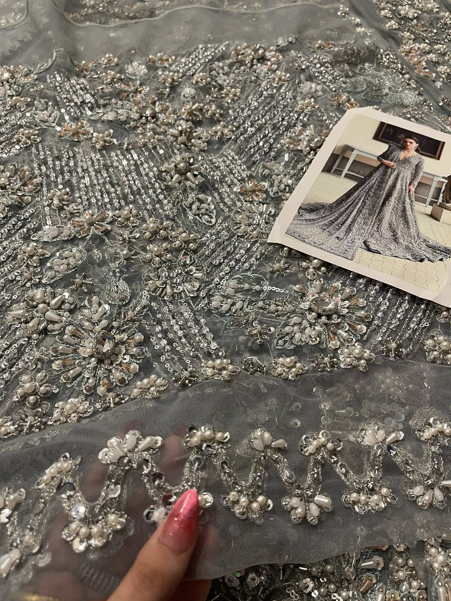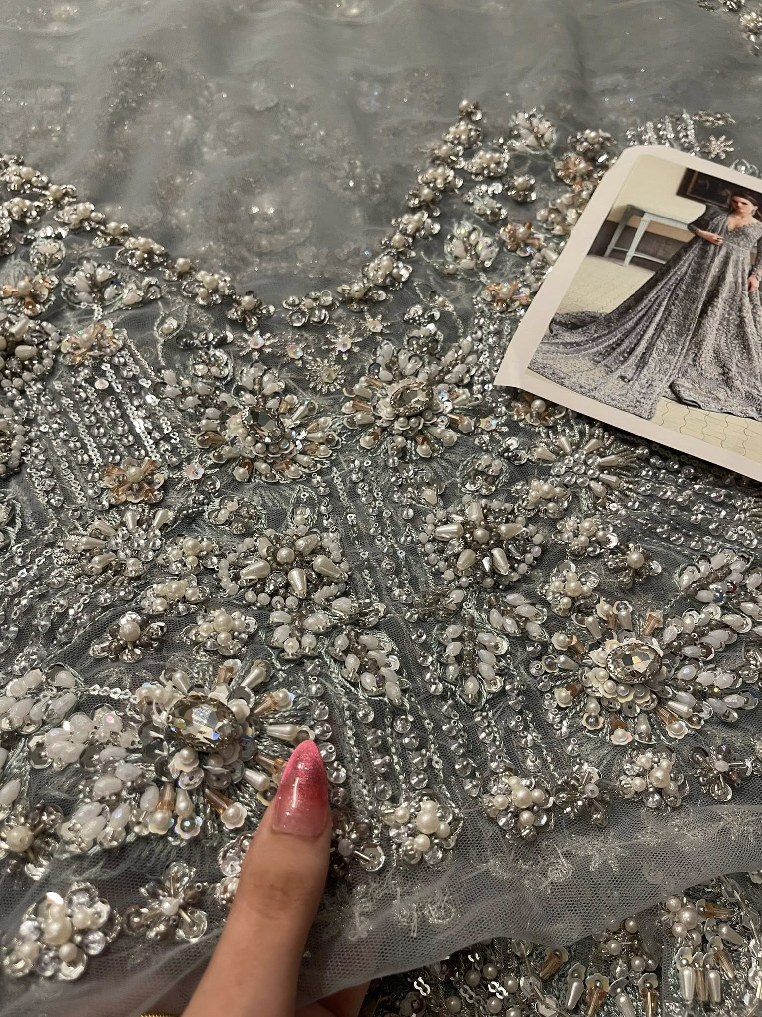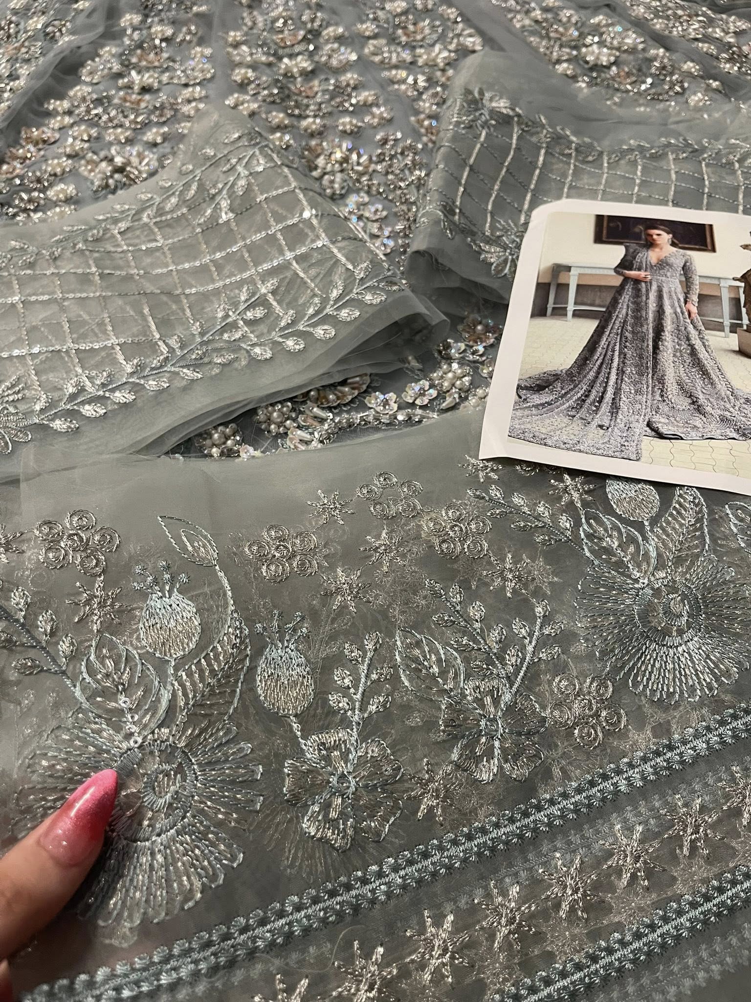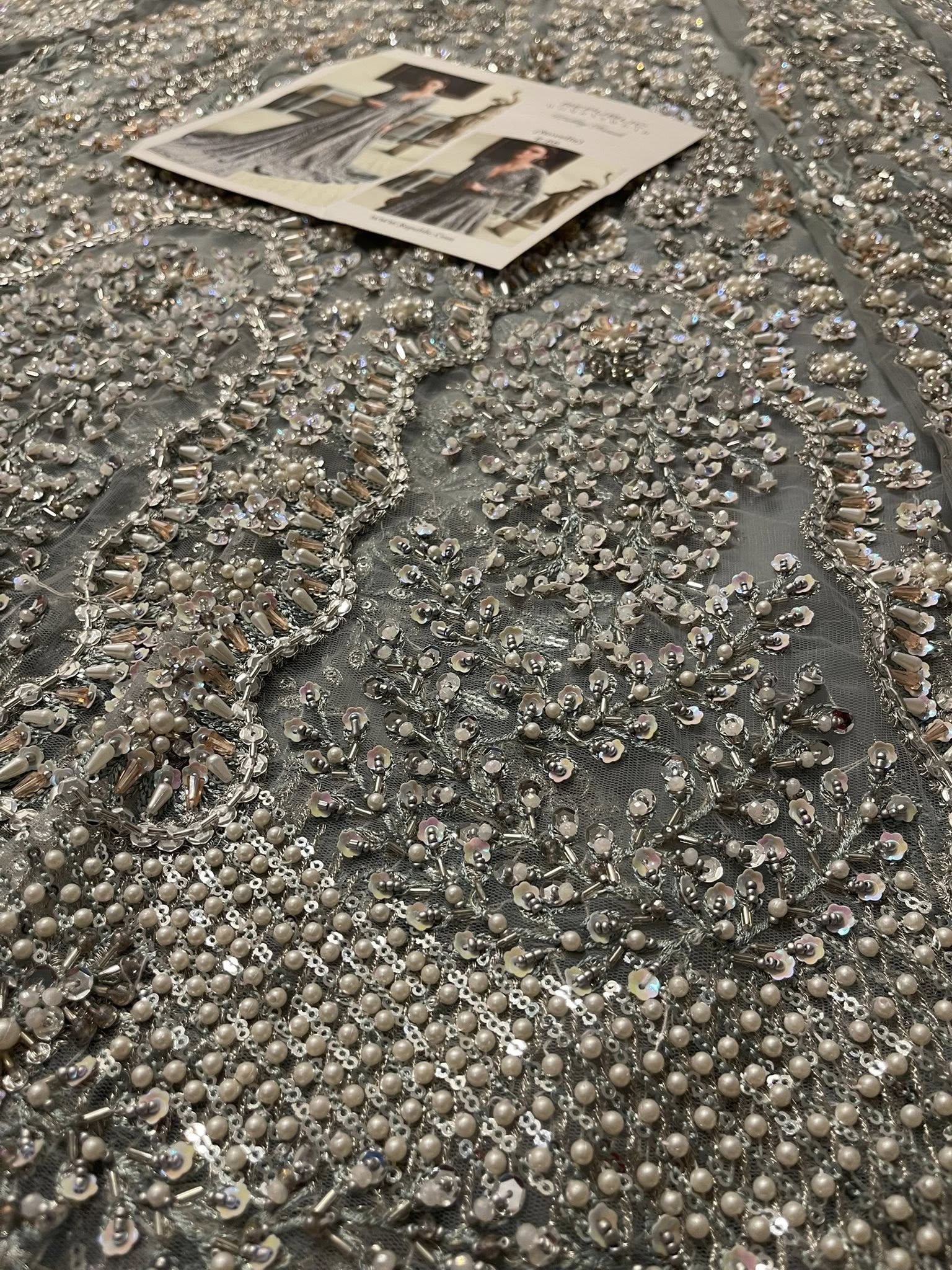 Novella is a V neckline gown, fully fitted and adorned with running floral compositions, leaves, petals, and branches. The gown features geometric details and organza pastels, enriched with tulle details, bethki, mukaish, and ribbon work. Intricate naqshi, kora, dabka, resham tilla work, Swarovski sequins, and cutdana add to its timeless elegance.