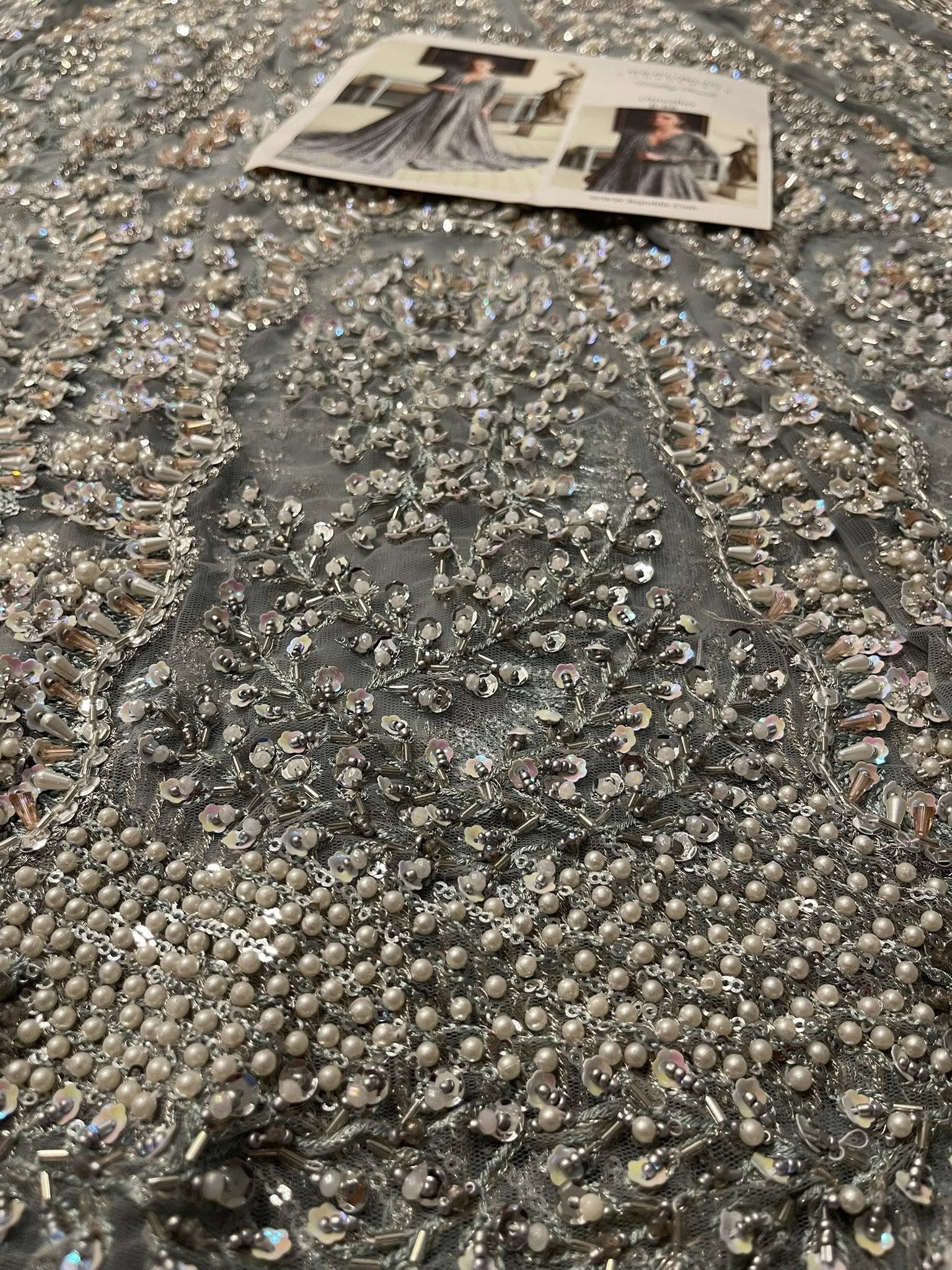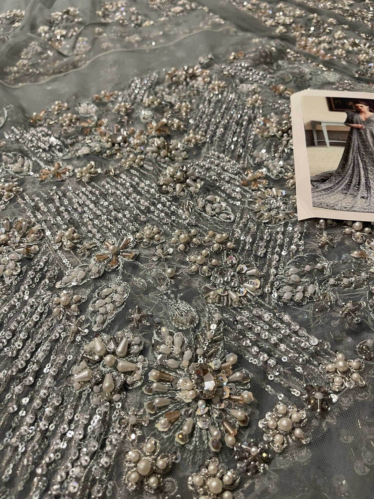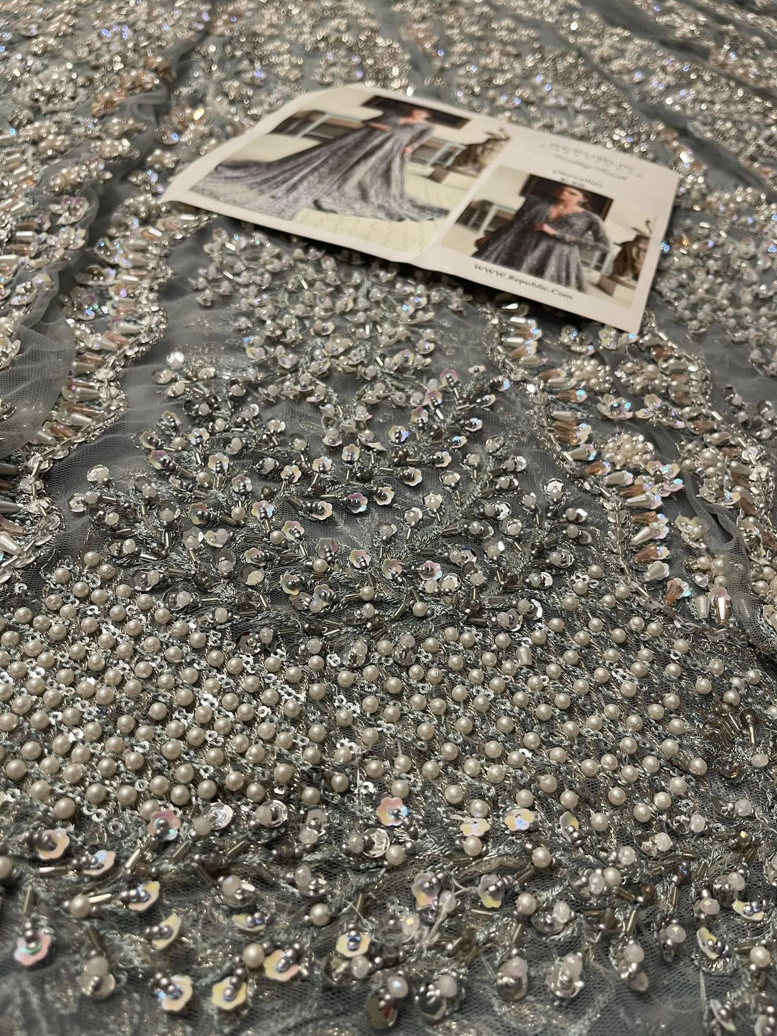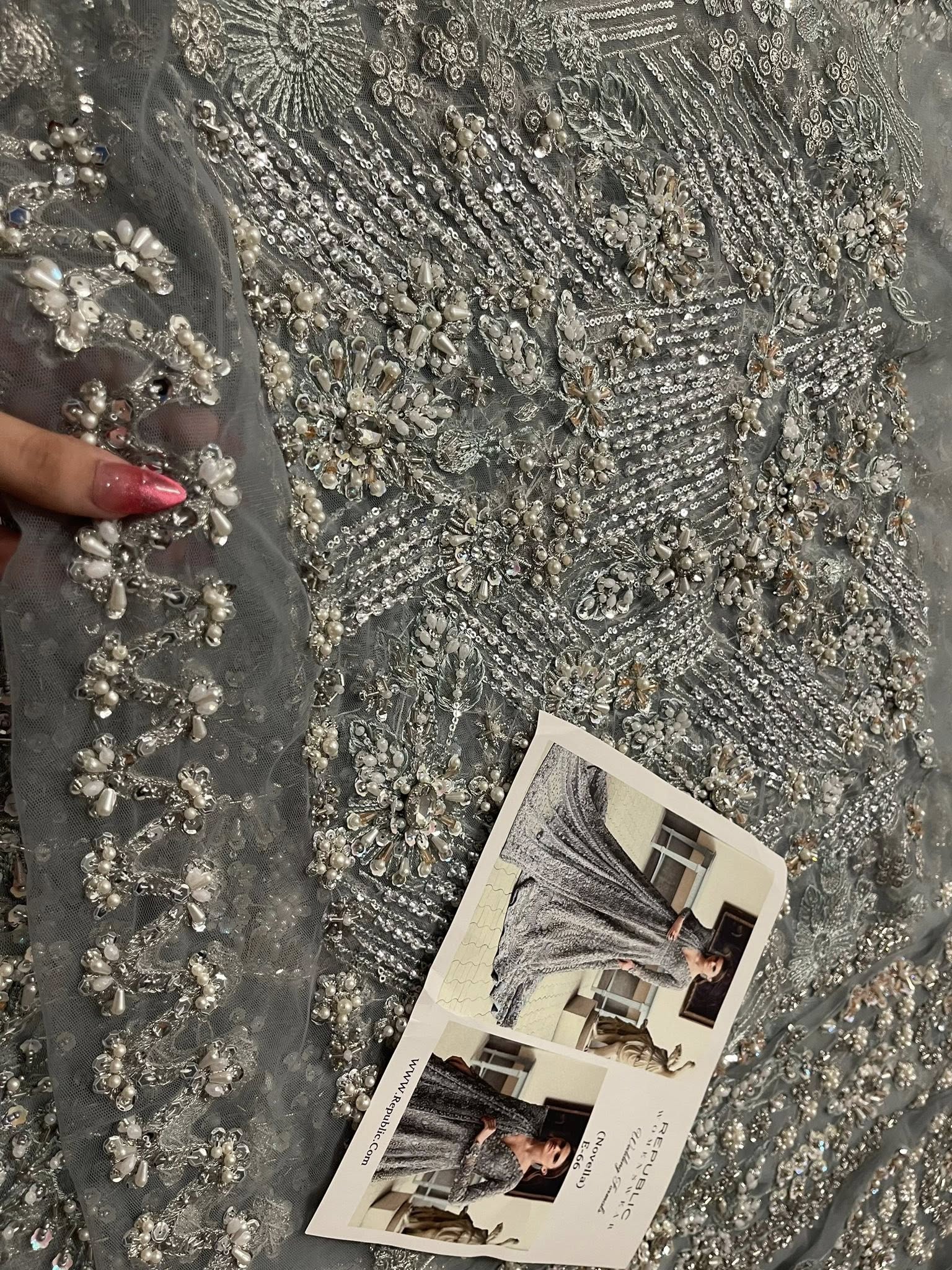 Novella is a V neckline gown, fully fitted and adorned with running floral compositions, leaves, petals, and branches. The gown features geometric details and organza pastels, enriched with tulle details, bethki, mukaish, and ribbon work. Intricate naqshi, kora, dabka, resham tilla work, Swarovski sequins, and cutdana add to its timeless elegance.
