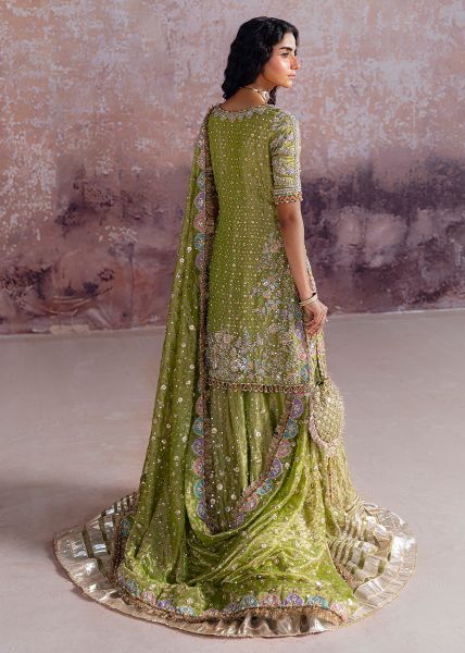 Shadan evokes the grandeur of a bygone era, where every detail was a testament to festivity. The shirt glistens with intricate zardozi work, its surfaces enlivened with delicate accents of colored thread. Playful handmade tassels dangle in gentle motion, like jeweled whispers echoing the liveliness of mehfils past. The dupatta unfurls as a tapestry of nostalgia, bordered richly on all four sides, its expanse scattered with a dense spray of sequins and mukaish. The edges, kissed with delicate kiren, recall the heirloom finishes of treasured trousseaux, carrying with them the romance of old-school charm. Anchoring the ensemble is a farshi gharara, opulent in sweep and grandeur. Its voluminous flare is scattered with embellishment, culminating in a hem weighted with resplendent gota, each stripe gleaming with the brilliance of molten gold. A matching pouch is a final accent that echoes its vintage soul, proving no detail is left untouched.