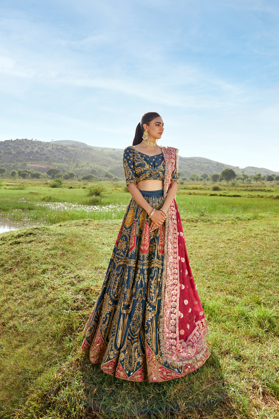A tusser silk lehenga and a choli set of an admiral blue hue splashed with fuschia and yellow intricacies, and golden handwork. A fuschia pink zari organza dupatta with with heavy embellishments makes this look perfect.