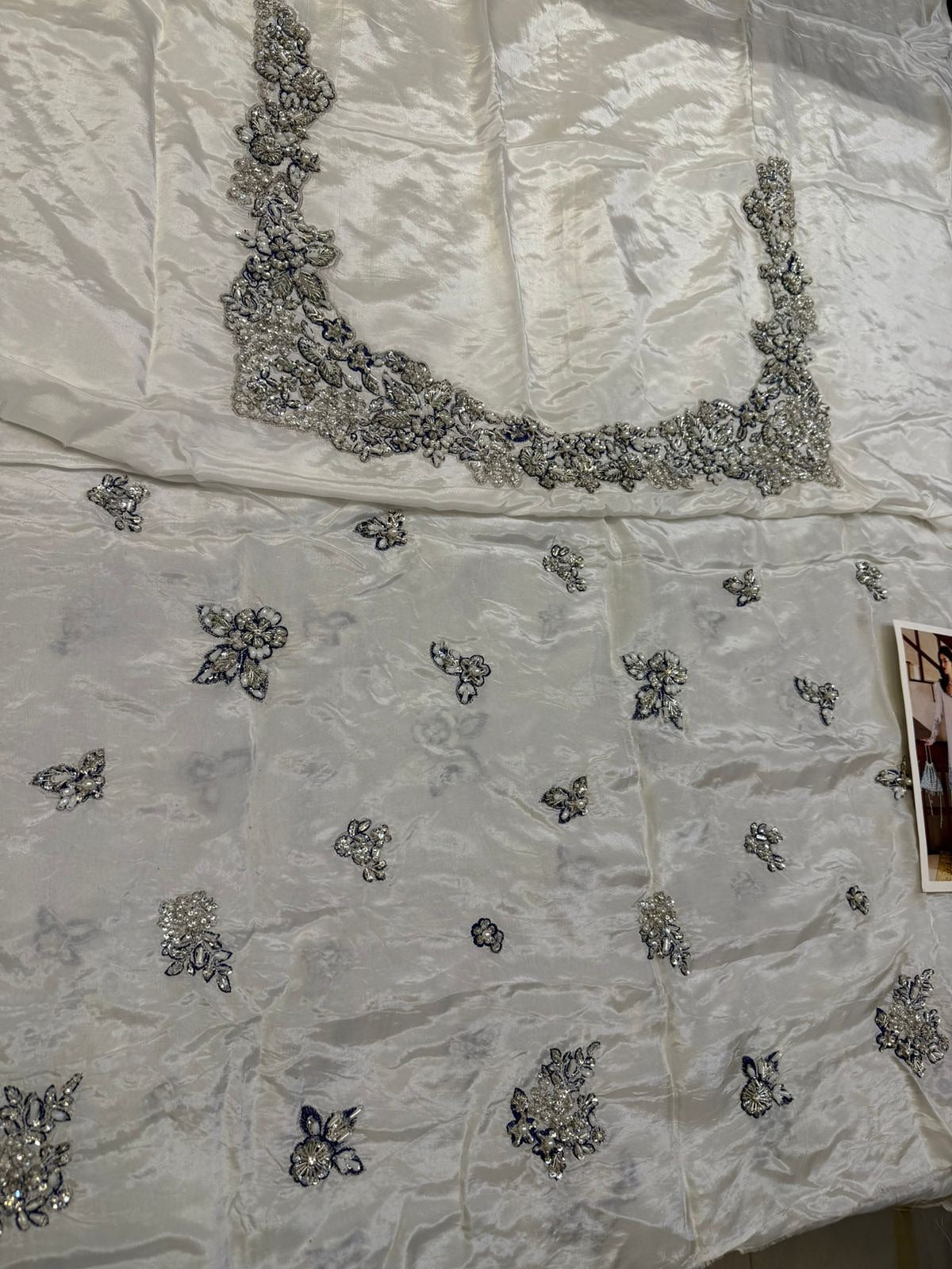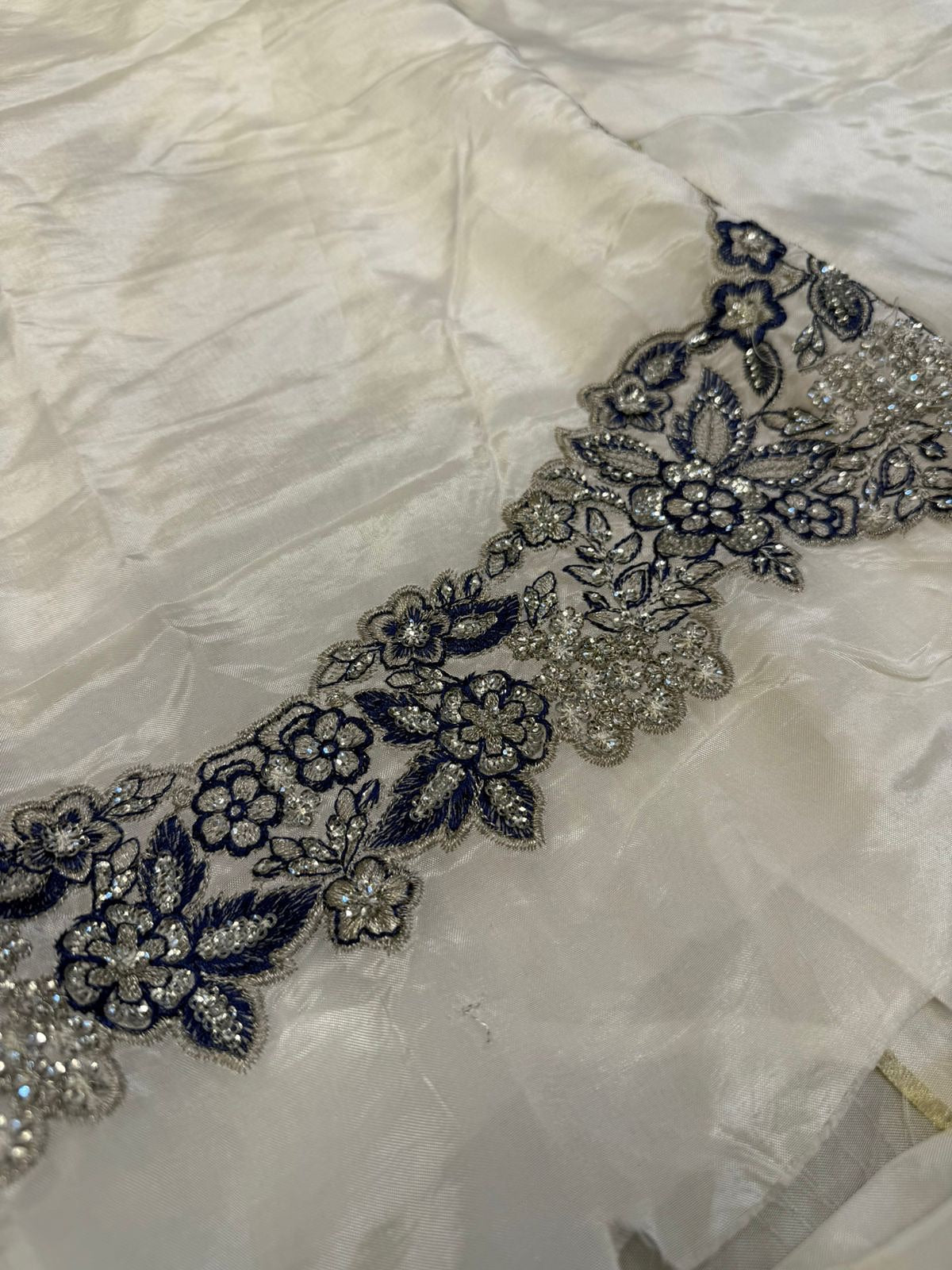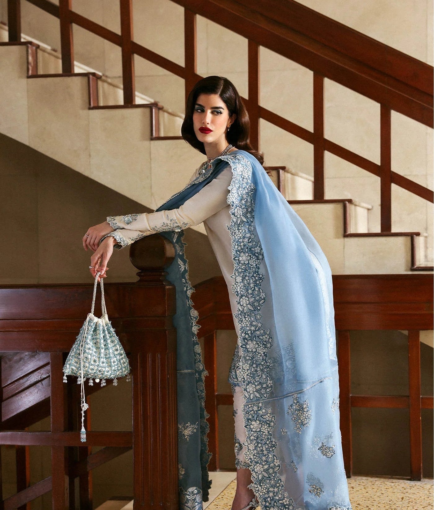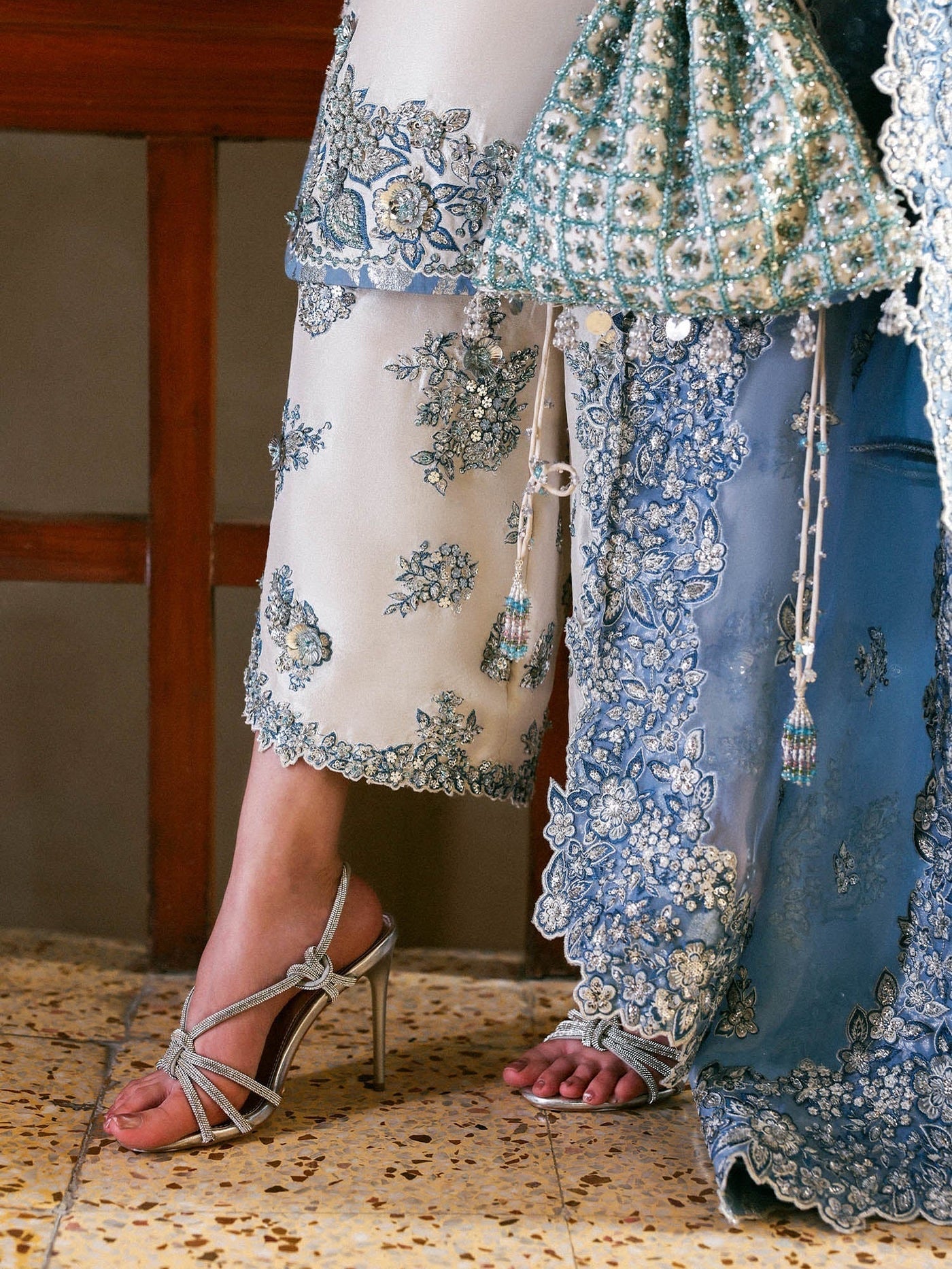 An ivory pure raw silk shirt embroidered in delicate threads of ivory and icy blue, accented with silver embellishments along the neckline, hem, and sleeves. Icy blue chanderi silk trims offer subtle contrast. Paired with matching culottes featuring intricate cutwork and a softly curved hem. The look is completed with a sheer organza dupatta in icy blue, finished with detailed floral embroidery and cutwork edging on all four sides.