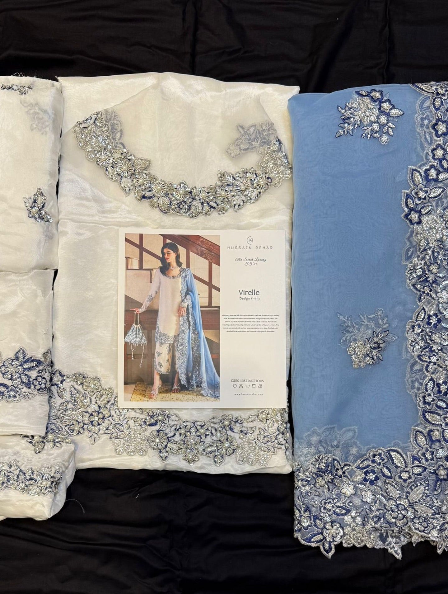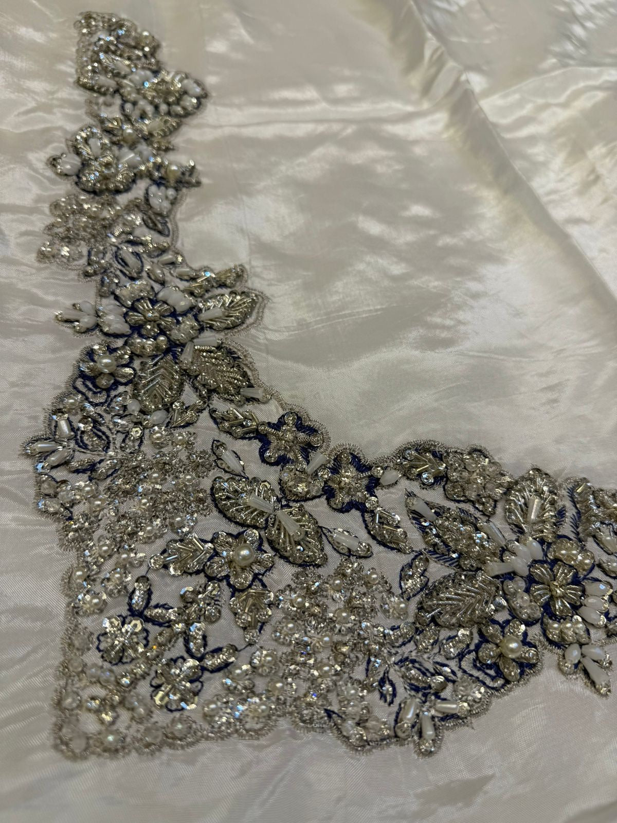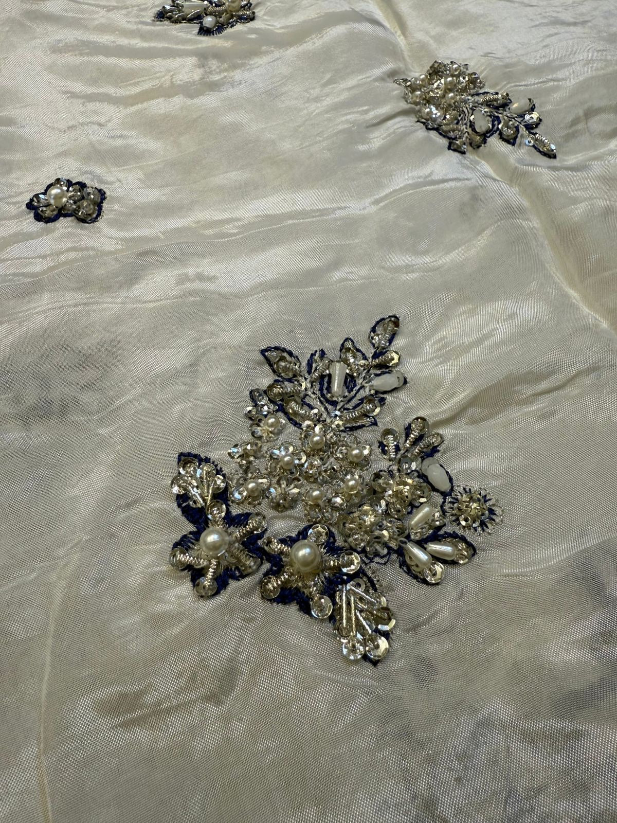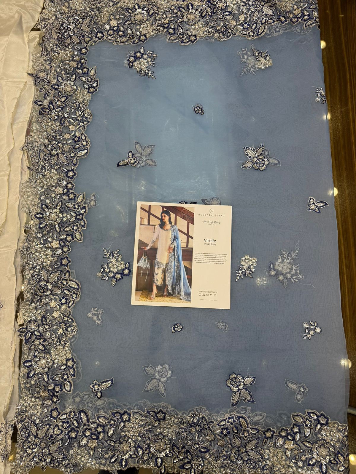 An ivory pure raw silk shirt embroidered in delicate threads of ivory and icy blue, accented with silver embellishments along the neckline, hem, and sleeves. Icy blue chanderi silk trims offer subtle contrast. Paired with matching culottes featuring intricate cutwork and a softly curved hem. The look is completed with a sheer organza dupatta in icy blue, finished with detailed floral embroidery and cutwork edging on all four sides.