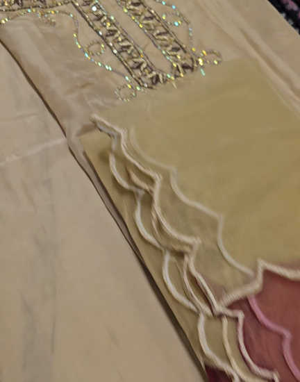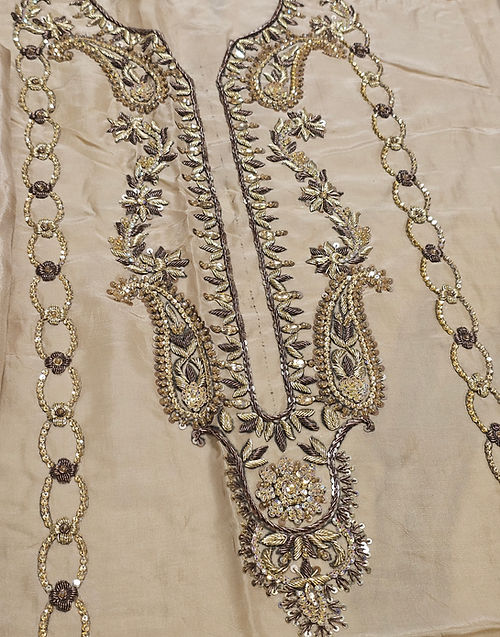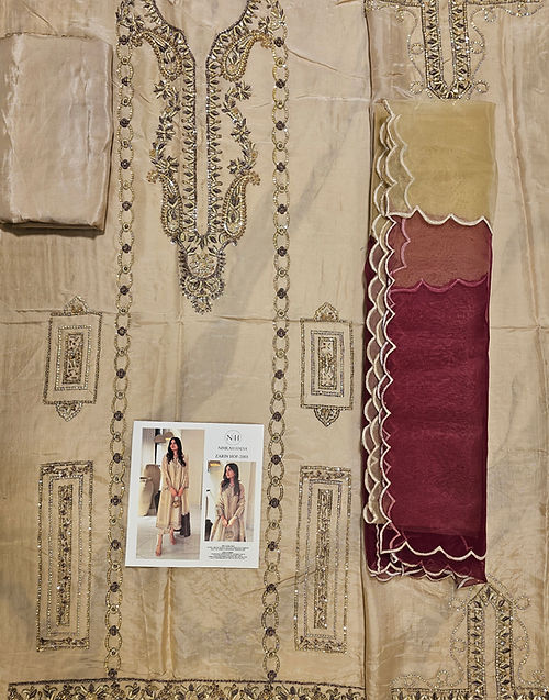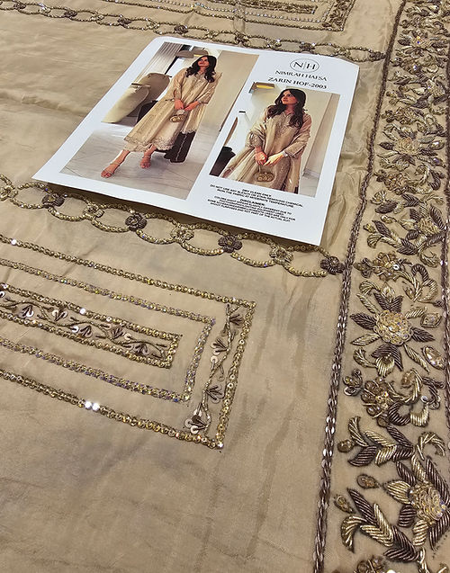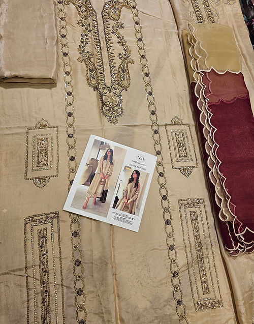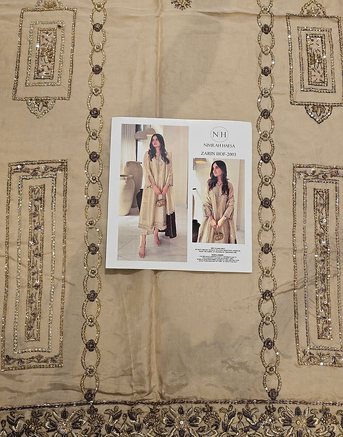 Crafted on on purè Lame, Zerin features refined handwork and a statement silhouette that flatters every angle. Paired with sleek straight culottes , it exudes effortless grace. A contrasting maroon block on dupatta witH intricate handwork and signature embroidery sets the look apart.